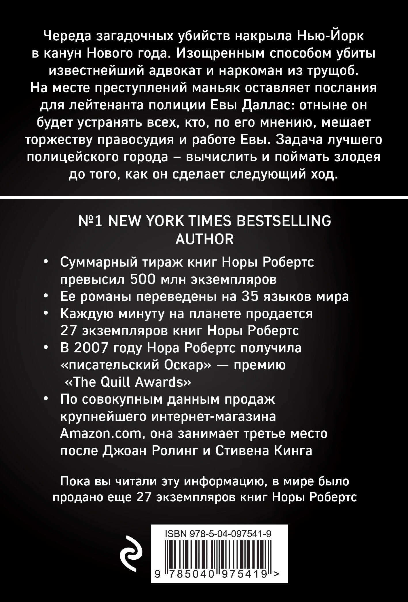 Череда загадочных убийств накрыла Нью-Йорк в канун Нового года. Изощренным способом убиты известнейший адвокат и наркоман из трущоб. На месте преступлений маньяк оставляет послания для лейтенанта полиции Евы Даллас: отныне он будет устранять всех, кто, по его мнению, мешает торжеству правосудия и работе Евы. Задача лучшего полицейского города - вычислить и поймать злодея до того, как он сделает следующий ход.| Издательство | ООО "Издательство "Эксмо" |