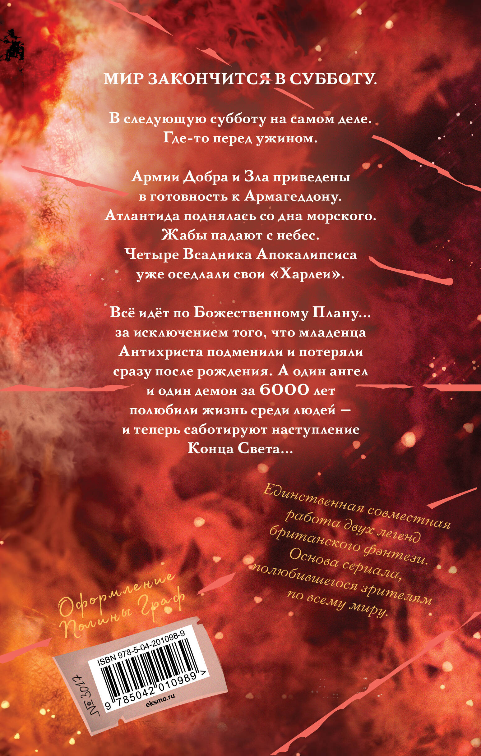 Мир закончится в субботу. В следующую субботу на самом деле. Где-то перед ужином. Армии Добра и Зла приведены в готовность к Армагеддону. Атлантида поднялась со дна морского. Жабы падают с небес. Четыре Всадника Апокалипсиса уже оседлали свои «Харлеи». Всё идёт по Божественному Плану... за исключением того, что младенца Антихриста подменили и потеряли сразу после рождения. А один ангел и один демон за 6000 лет полюбили жизнь среди людей - и теперь саботируют наступление Конца Света... Коллекционное издание в двух вариантах оформления: для поклонников Азирафаэля и Кроули. Единственная совместная работа двух легенд британского фэнтези: Нила Геймана и сэра Терри Пратчетта. По книге снят одноименный сериал с Дэвидом Теннантом и Майклом Шином, полюбившийся зрителям по всему миру. Финалист Всемирной премии фэнтези в категории «Лучший роман», «Самая долгожданная книга» по версии журнала «Мир Фантастики», бестселлер The New York Times. Оформление суперпопулярной в России художницы и писательницы Полины Граф. Внутри портреты персонажей и авторов книги, черно-белые рисунки в тексте и дополнительная цветная иллюстрация. Новая обложка + суперобложка и цветной обрез!| Издательство | ООО "Издательство "Эксмо" |