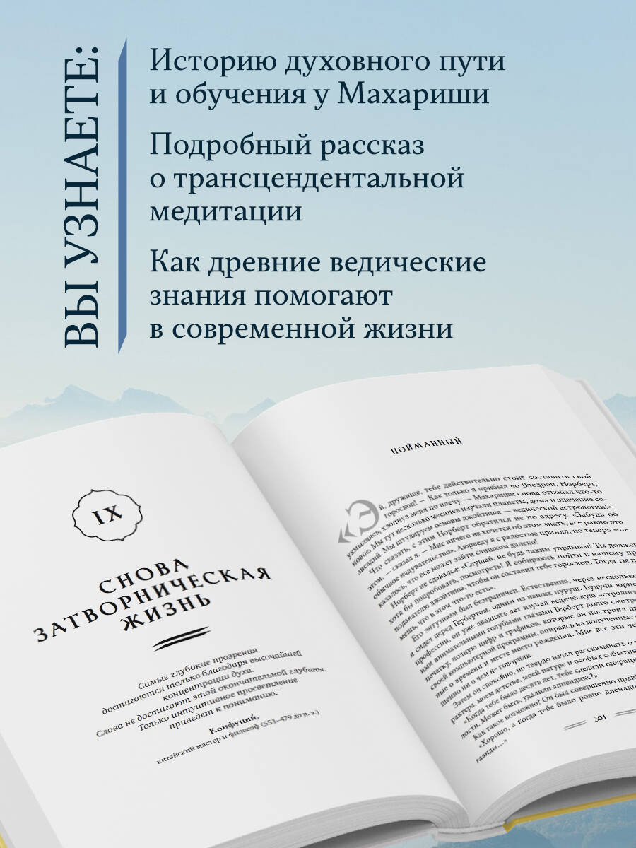 Книга о великом индийском гуру Махариши, создателем Трансцендентальной медитации, написанная его немецким учеником. В книге описан глубокий медитативный опыт, а также захватывающие приключения, удачи, сомнения и конфликты на пути развития западных центров Трансцендентальной медитации.| Издательство | ООО "Издательство "Эксмо" |
