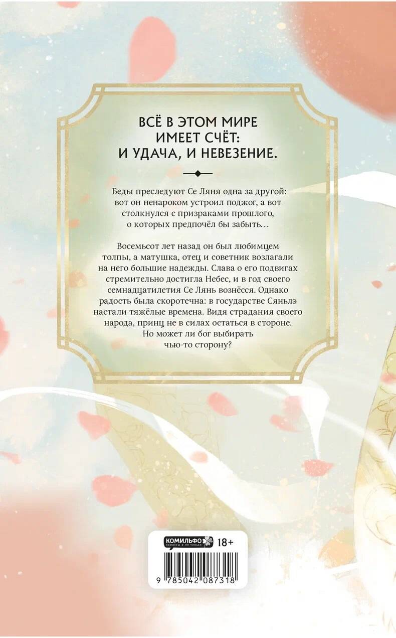 Всё в этом мире имеет счёт: и удача, и невезение. Беды преследуют Се Ляня одна за другой: вот он ненароком устроил поджог, а вот столкнулся с призраками прошлого, о которых предпочёл бы забыть… Восемьсот лет назад он был любимцем толпы, а матушка, отец и советник возлагали на него большие надежды. Слава о его подвигах стремительно достигла Небес, и в год своего семнадцатилетия Се Лянь вознёсся. Однако радость была скоротечна: в государстве Сяньлэ настали тяжёлые времена. Видя страдания своего народа, принц был не в силах остаться в стороне. Но может ли бог выбирать чью-то сторону?| Издательство | ООО "Издательство "Эксмо" |