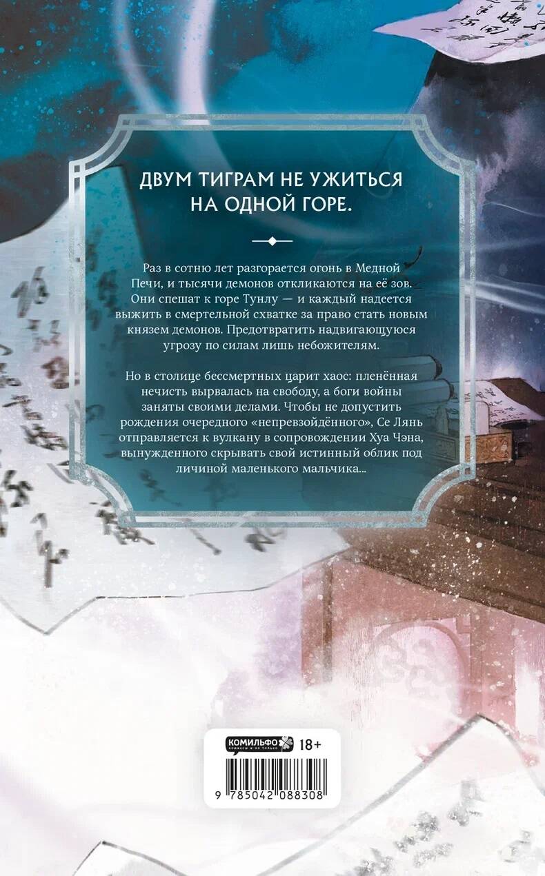 ДВУМ ТИГРАМ НЕ УЖИТЬСЯ НА ОДНОЙ ГОРЕ. Раз в сотню лет разгорается огонь в Медной Печи, и тысячи демонов откликаются на её зов. Они спешат к горе Тунлу - и каждый надеется выжить в смертельной схватке за право стать новым князем демонов. Предотвратить надвигающуюся угрозу по силам лишь небожителям. Но в столице бессмертных царит хаос: пленённая нечисть вырвалась на свободу, а боги войны заняты своими делами. Чтобы не допустить рождения очередного «непревзойдённого», Се Лянь отправляется к вулкану в сопровождении Хуа Чэна, вынужденного скрывать свой истинный облик под личиной маленького мальчика...| Издательство | ООО "Издательство "Эксмо" |