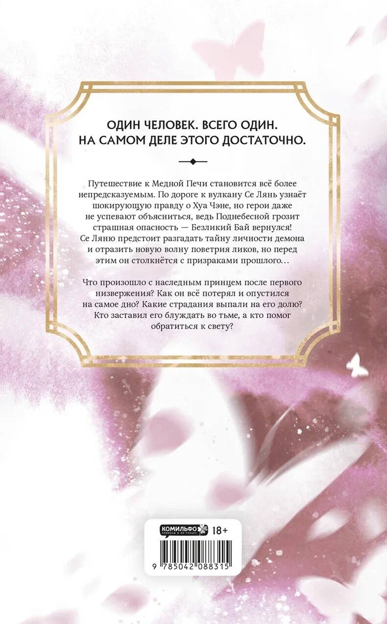 ОДИН ЧЕЛОВЕК. ВСЕГО ОДИН. НА САМОМ ДЕЛЕ ЭТОГО ДОСТАТОЧНО. Путешествие к Медной Печи становится всё более непредсказуемым. По дороге к вулкану Се Лянь узнаёт шокирующую правду о Хуа Чэне, но герои даже не успевают объясниться, ведь Поднебесной грозит страшная опасность - Безликий Бай вернулся! Се Ляню предстоит разгадать тайну личности демона и отразить новую волну поветрия ликов, но перед этим он столкнётся с призраками прошлого… Что произошло с наследным принцем после первого низвержения? Как он всё потерял и опустился на самое дно? Какие страдания выпали на его долю? Кто заставил его блуждать во тьме, а кто помог обратиться к свету?| Издательство | ООО "Издательство "Эксмо" |