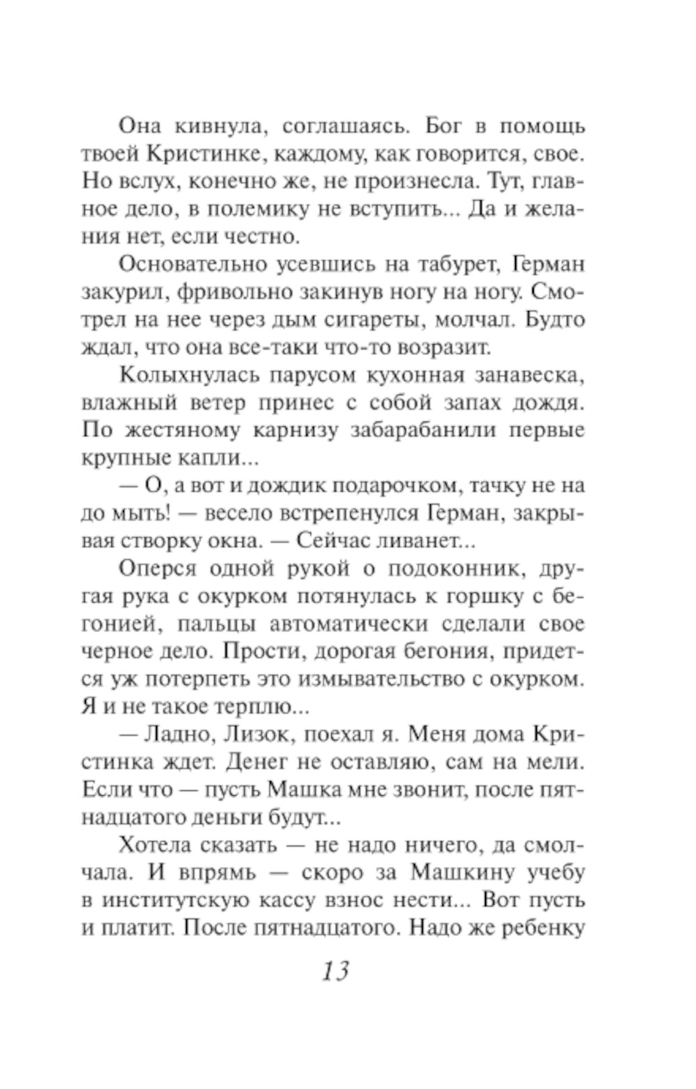 Библиография Веры Колочковой насчитывает более 60 романов, многие из которых уже воплощены на экране. Любовь к автору вполне объяснима, ведь она пишет об обычных людях, которые стремятся к лучшей жизни и борются за собственное счастье. Простые и чувственные, увлекательные и романтичные, романы Колочковой задевают за живое, заставляя сопереживать и радоваться героям как своим знакомым. Лиза казалась в своем кругу юродивой. Слишком мягкая, слишком скромная, она могла услышать в шелесте листьев пятую симфонию Рахманинова. Эта женщина была обречена оставаться белой вороной. Но однажды Лизе вдруг встретился человек, удивительно похожий на нее саму, правда, давно и неудачно женатый на властной и грубой женщине. Слишком много условий, препятствующих союзу. Сможет ли эта необычная пара достичь счастья?| Издательство | Эксмо |