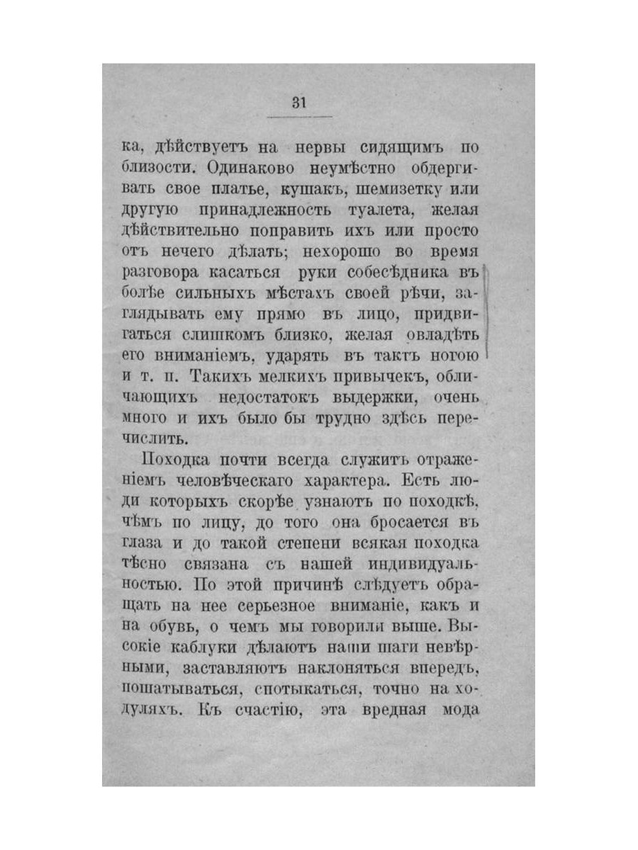 В начале прошлого века считалось, что женщина должна заниматься своей красотой не для удовольствия, доставляемого ей ее триумфами и победами, но для того, чтобы нравиться всем и каждому и дать счастье тому, кого она избрала, кому она доверила свою жизнь. Так же было необыкновенно важно умение держать себя тактично и безукоризненно в обществе и дома. Кто же из нас, провидя подобную роль не пожелал бы быть грациозной и прекрасной? В данных практических советах указывается, как достичь столь возвышенной цели.| Издательство | Т8 RUGRAM |