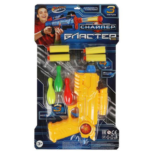 Игровой набор с бластером "Снайпер" ТМ "Играем вместе" непременно понравится юному герою: - оригинальный дизайн - бластер стреляет пулями - дальность стрельбы: до 3 м В комплекте: - бластер - 4 пули на присосках - 3 кегли С этим игровым оружием ваш ребёнок будет придумывать увлекательные спецзадания, защищать мир и стоять на страже порядка. С таким бластером маленький герой станет самым метким стрелком. Набор подойдёт для активных игр на воздухе и в помещении. Игры с набором ТМ "Играем вместе" помогут развить: - координацию движений - воображение - ловкость и меткость - внимание - моторику Размер: 18 х 4 х 15 см. Материал: пластмасса. Рекомендовано детям от 3-х лет.