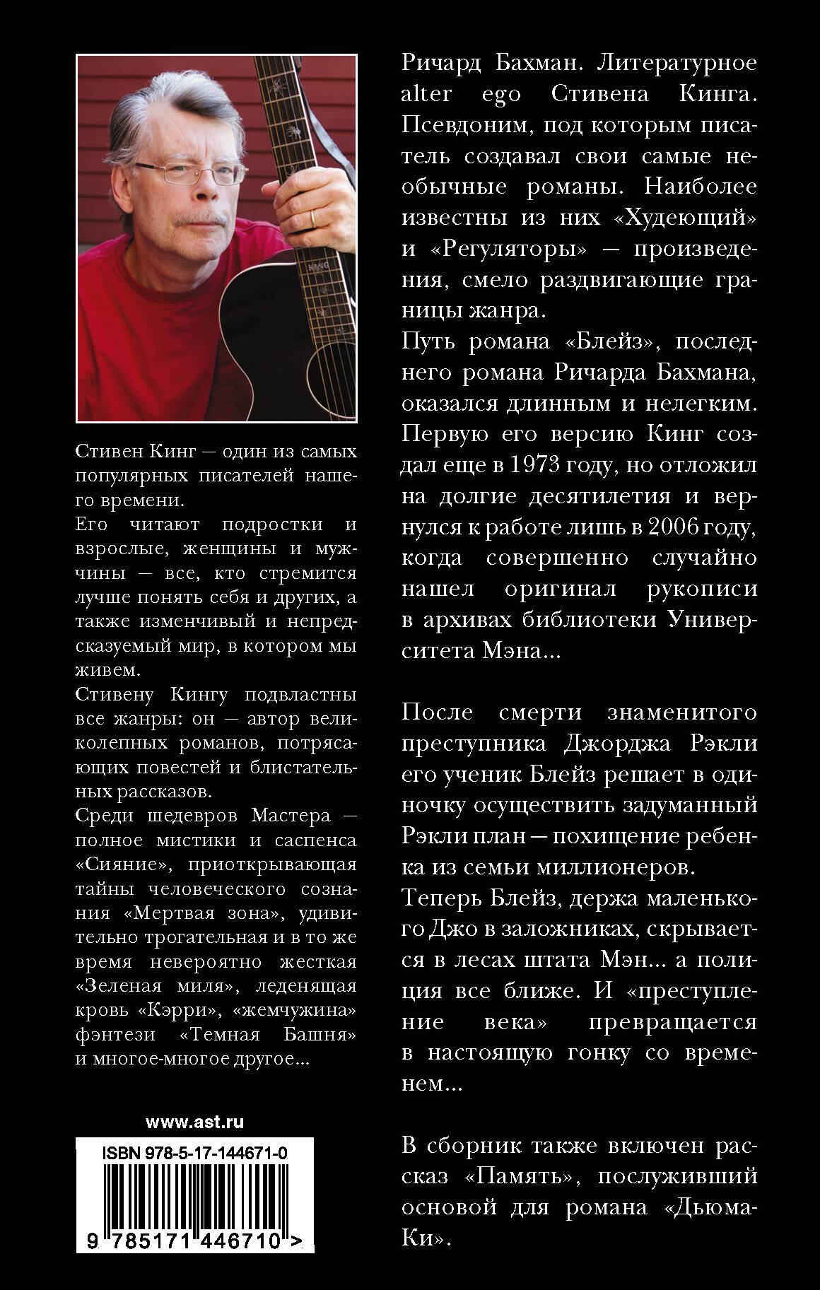 После смерти знаменитого преступника Джорджа Рэкли его ученик Блейз решает в одиночку осуществить задуманный Рэкли план - похищение ребенка из семьи миллионеров. Теперь Блейз, держа маленького Джо в заложниках, скрывается в лесах штата Мэн... а полиция все ближе. И "преступление века" превращается в настоящую гонку со временем. В сборник также включен рассказ "Память", послуживший основой для романа "Дьюма-Ки".| Издательство | ИЗДАТЕЛЬСТВО "АСТ" |