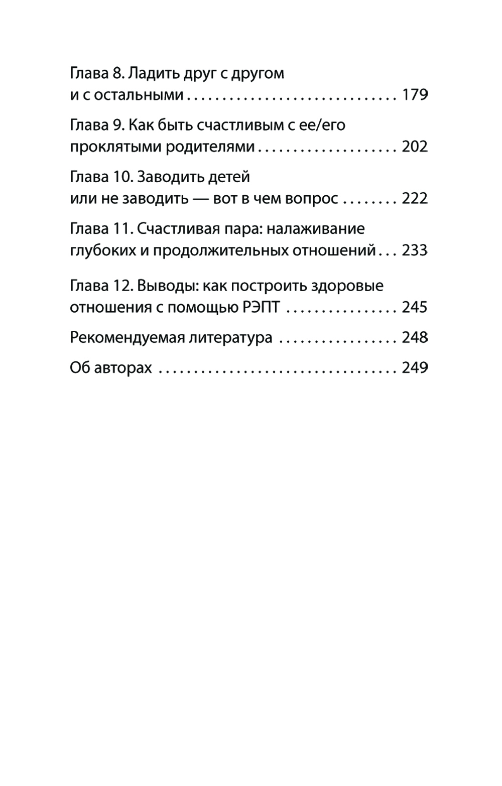 Ваши отношения дают трещину? Вы меняете партнеров, а проблемы при этом остаются? Вы чувствуете, что со временем любовь остывает? Люди, не желающие признать, что в ситуации виноваты оба партнера, переносят свои проблемы в следующие отношения. Как отмечают в данной книге Эллис и Харпер, легче обвинить другого, чем решать проблемы самому. Читатели, которые надеются с помощью этой книги наладить свои отношения, несомненно, получат результат. Во-первых, книга написана просто и увлекательно. Во-вторых, для пояснения идей авторов приводятся примеры и диалоги. В-третьих, запутанных терминов и «психологической болтовни» здесь практически нет - это понятная книга с логичными идеями. В-четвертых, упражнения в конце глав дадут почву для размышлений и помогут сделать важные выводы. Эта книга поможет избавиться от неправильных привычек и вступить на новый путь отношений.| Издательство | Питер |