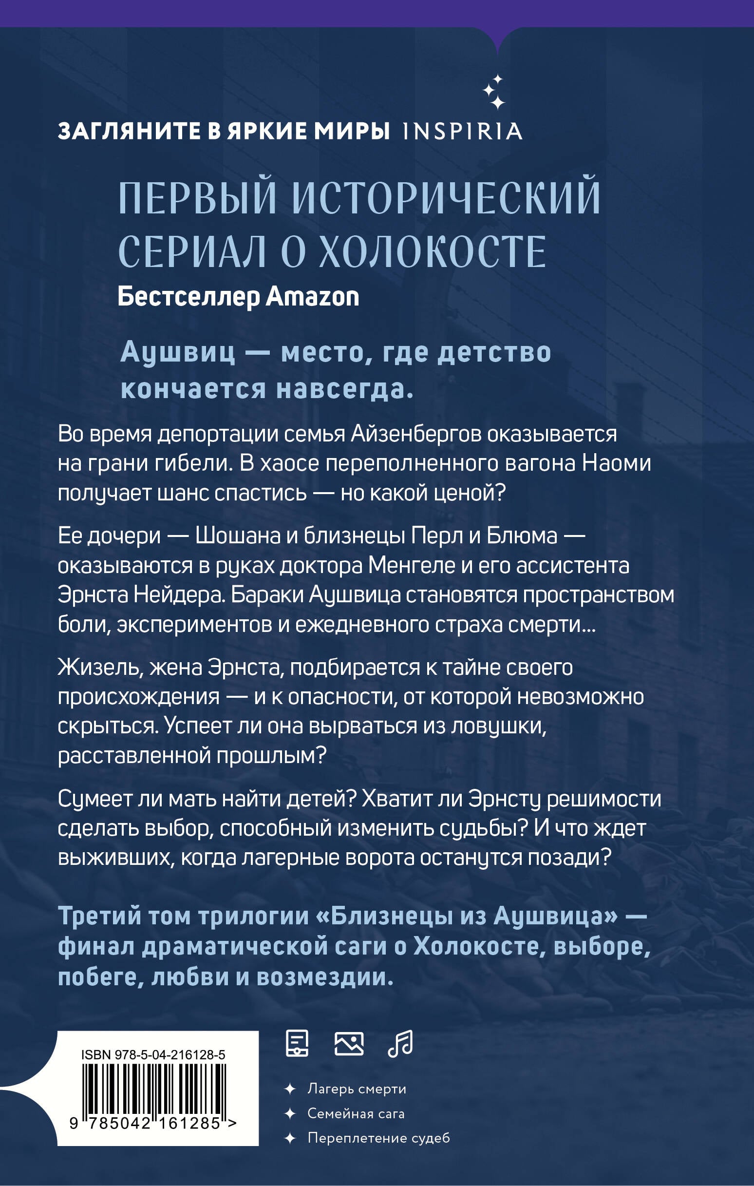 ПЕРВЫЙ ИСТОРИЧЕСКИЙ СЕРИАЛ О ХОЛОКОСТЕ. Бестселлер Amazon.com. Аушвиц - место, где детство заканчивается, а выживание становится единственной целью. Во время депортации семья Айзенбергов оказывается разорвана. В хаосе переполненного вагона Наоми получает шанс спастись - но какой ценой? Сможет ли она выжить в одиночку и снова увидеть дочерей? Шошана и близнецы Перл и Блюма попадают в самое сердце лагерного ужаса - в бараки доктора Менгеле. Здесь дети становятся объектами экспериментов, а каждый день может стать последним. Что поможет им выстоять - страх или связь между сестрами? Рядом с Менгеле работает врач Эрнст, все глубже втянутый в лагерную машину смерти. Сможет ли он сделать выбор между подчинением и человечностью, когда цена ошибки - жизнь? Тем временем за пределами лагеря Жизель приближается к опасной тайне своего происхождения. Не зная, к чему приведет этот поиск, она делает шаги, которые могут оказаться роковыми... Но даже если кому-то удастся спастись, война не заканчивается вместе с лагерями... Третий том трилогии «Близнецы из Аушвица» - финал драматической саги о Холокосте, выборе, побеге, любви и возмездии.| Издательство | ООО "Издательство "Эксмо" |