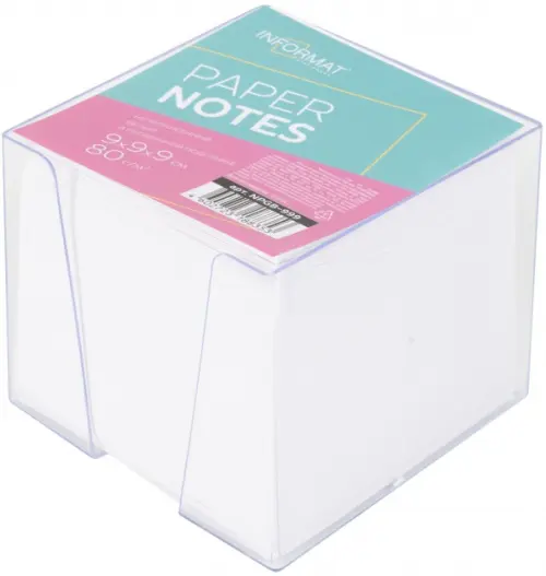 Подставка с белым бумажным блоком для записи. Подставка изготовлена из прозрачного пластика. Белый блок изготовлен из высококачественной офсетной бумаги плотностью 65 г/м2 и белизной 92 %, непроклеенный.