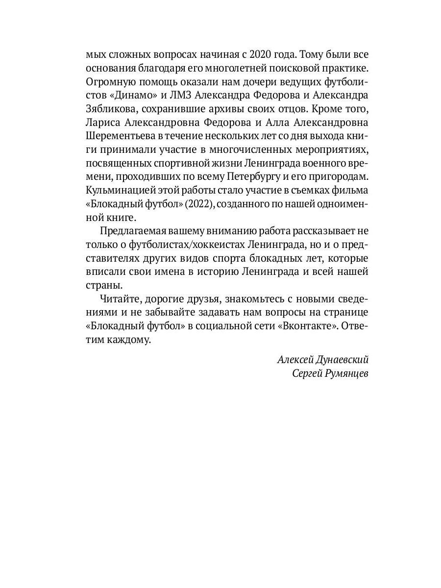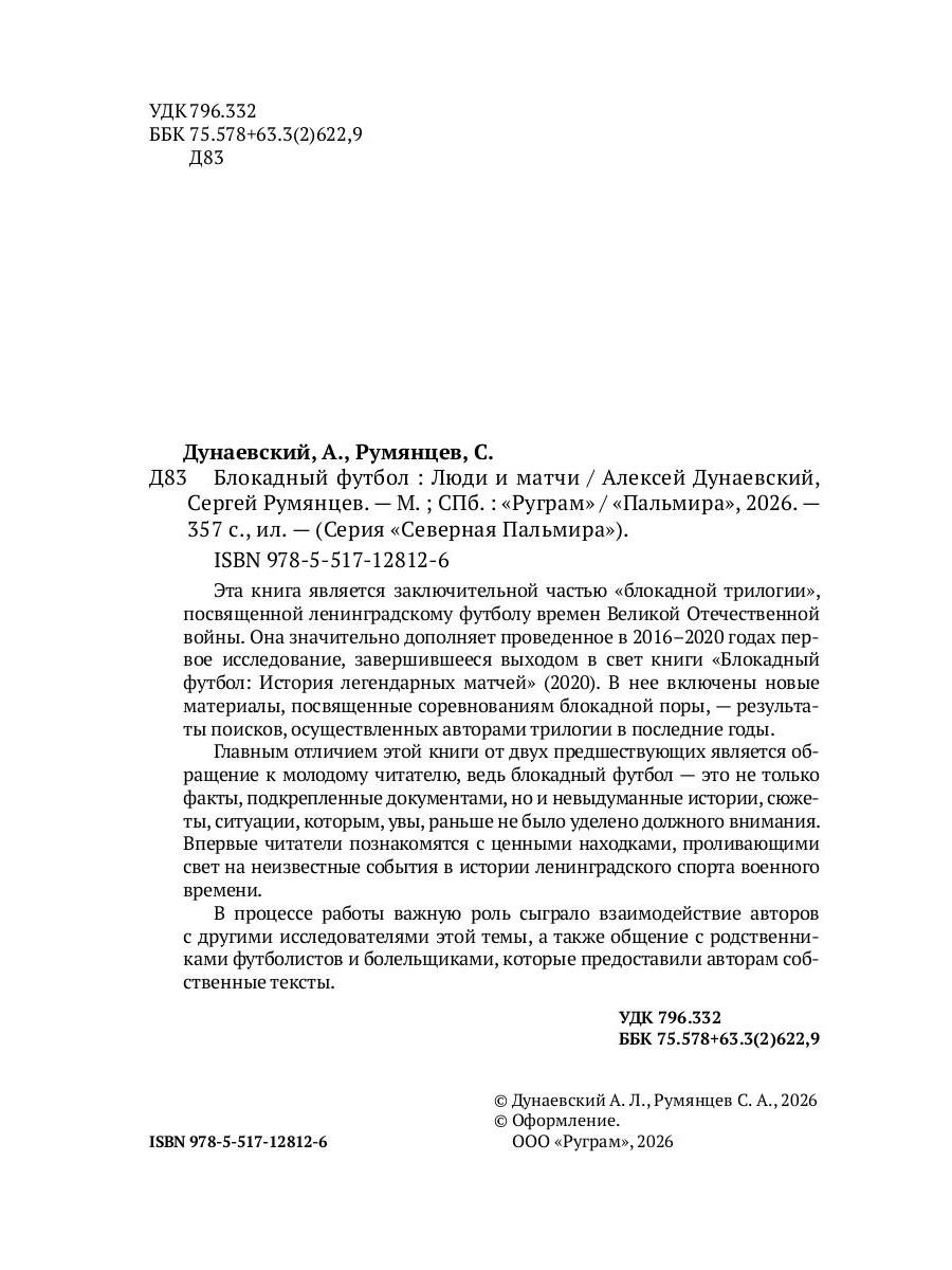 Эта книга является заключительной частью «блокадной трилогии», посвященной ленинградскому футболу времен Великой Отечественной войны. Она значительно дополняет проведенное в 2016-2020 годах первое исследование, завершившееся выходом в свет книги «Блокадный футбол: История легендарных матчей» (2020). В нее включены новые материалы, посвященные соревнованиям блокадной поры, - результаты поисков, осуществленных авторами трилогии в последние годы. Главным отличием этой книги от двух предшествующих является обращение к молодому читателю, ведь блокадный футбол - это не только факты, подкрепленные документами, но и невыдуманные истории, сюжеты, ситуации, которым, увы, раньше не было уделено должного внимания. Впервые читатели познакомятся с ценными находками, проливающими свет на неизвестные события в истории ленинградского спорта военного времени. В процессе работы важную роль сыграло взаимодействие авторов с другими исследователями этой темы, а также общение с родственниками футболистов и болельщиками, которые предоставили авторам собственные тексты.| Издательство | Т8 RUGRAM |