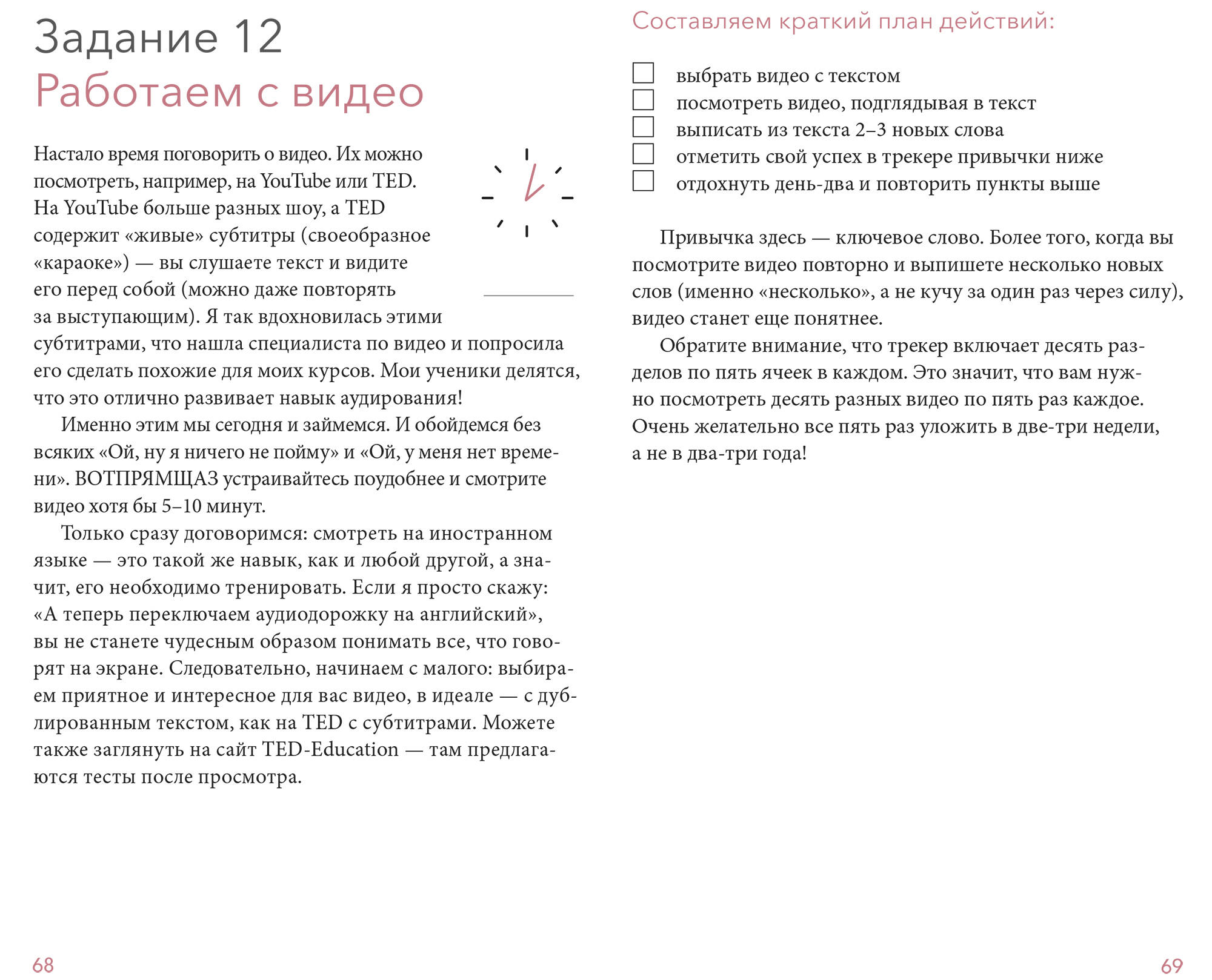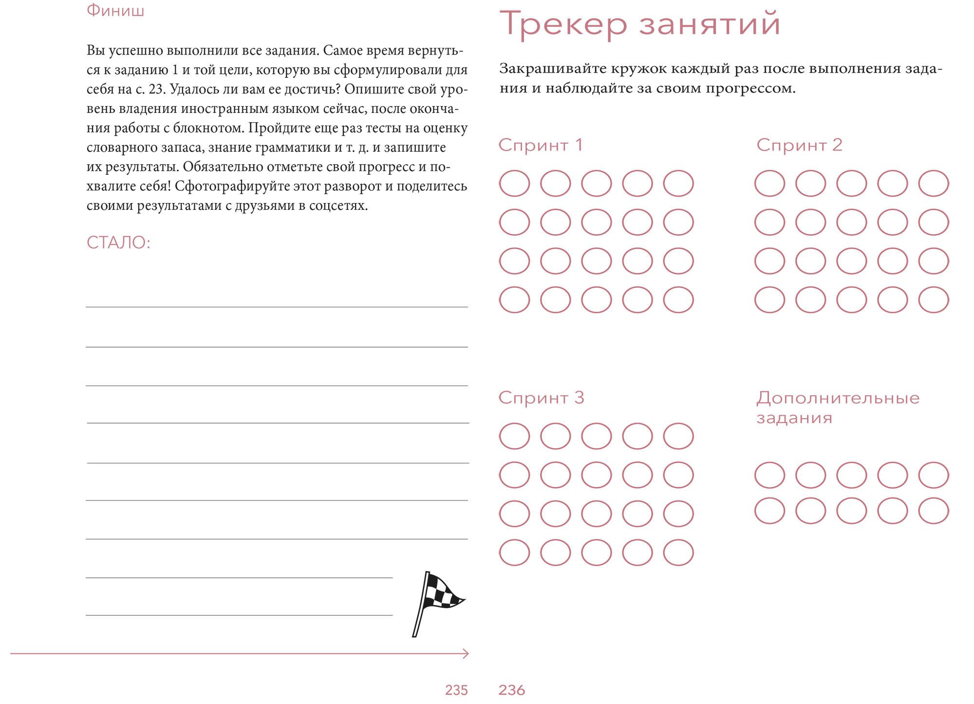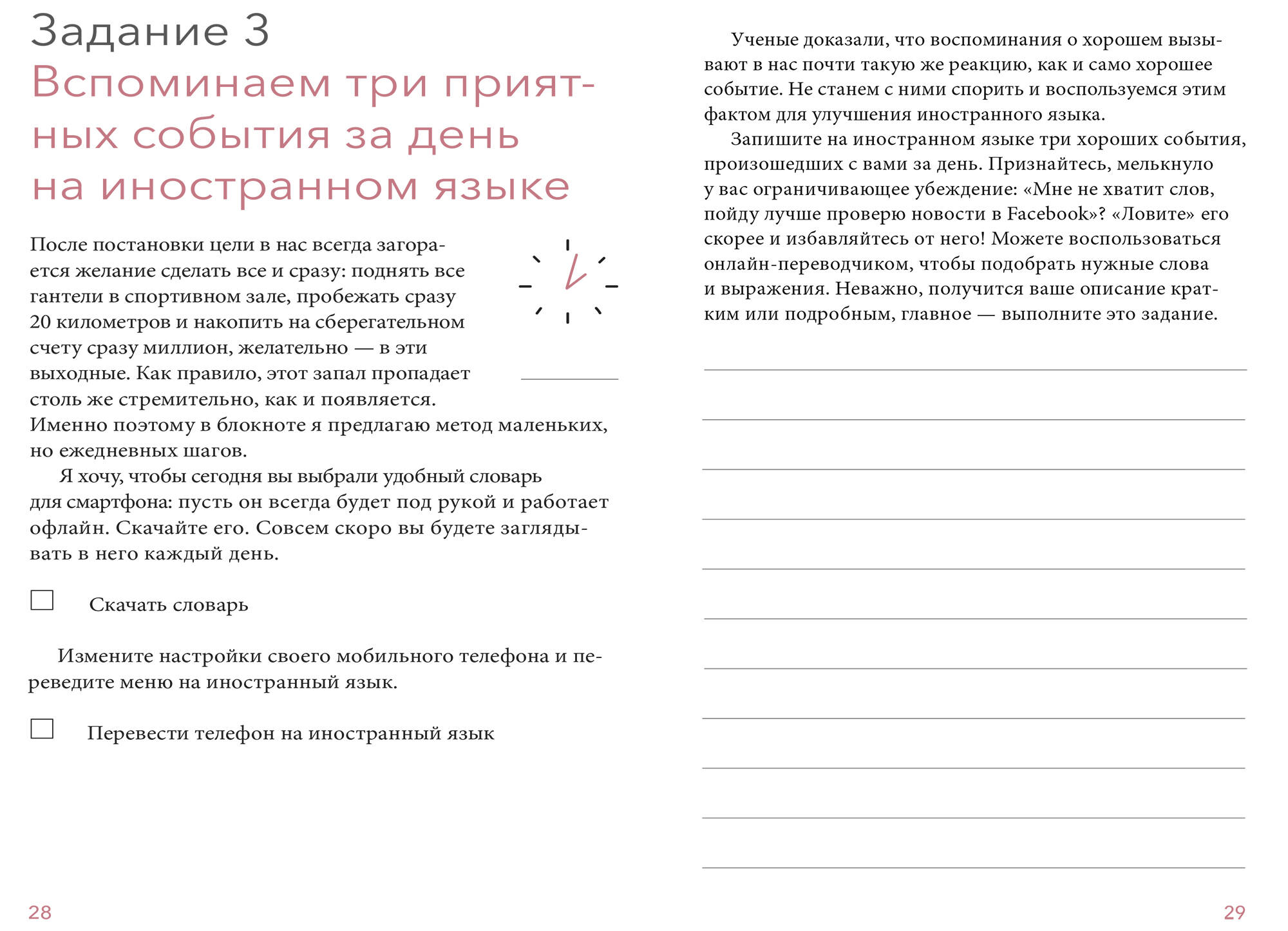 В этом блокноте вы найдете необходимую теорию и интересные нестандартные задания, которые помогут по-другому посмотреть на изучение иностранного языка и сделать его частью своей повседневной жизни. Открывайте блокнот каждый день или пару раз в неделю, выполняйте несложные задания и наблюдайте, как с каждым разом ваш иностранный язык становится лучше. Для кого эта книга: Для тех, кто учит иностранный язык уже пару десятилетий, но так и не достиг желаемого результата. Для тех, кто только начинает изучать иностранный язык. Для тех, кто учит иностранный язык трудолюбиво и без прокрастинации, но хочет разнообразить занятия. Для тех, кто любит учиться, но хочет делать это НЕ скучно. Для тех, кому не хватает структуры - вокруг так много материалов по языку - непонятно, за что хвататься. От автора: Привет, я - Настя, автор книг "Как перестать учить иностранный язык и начать на нем жить" и "Язык как игра", преподаватель, блогер, спикер TEDx. Последние 14 лет я рассказываю и показываю своим ученикам, как учить английский в стиле lifelong learning и edutainment (да-да, я начала практиковать их еще до того, как эти понятия пришли в русский язык). Моя первая книга "Как перестать учить иностранный язык и начать на нем жить" вышла в 2019 году и сразу стала бестселлером. Но я начала получать много писем с просьбой сделать более практическую книгу, а еще лучше ежедневник, в котором можно писать. Как говорит Максим Дорофеев, между срочным и важным мы всегда выбираем понятное. Этот блокнот поможет всем, у кого разбегаются глаза - вроде столько всего можно сделать на английском, и телефон лопается от приложений, но нет понимания, что конкретно делать именно сегодня? Теперь вы можете просто открывать этот блокнот и совершать небольшой шаг в сторону изучения иностранного языка. Очень важно, конечно, делать это регулярно. Устройте себе челлендж - получится ли у вас 20 дней подряд выполнять упражнения в ежедневнике? Я специально разделила задания на спринты: 20 заданий в первом и еще 20 - во втором. Третий спринт вы сможете составить для себя сами. Вообще, основная цель любого моего проекта - курса, книги или вебинара - дать вам удочку, а не рыбу. Потому что иностранный язык бесконечен, и вам предстоит жить на нем много лет. Это значит, вы должны представлять, что нужно делать и зачем. Попробуйте окунуться в язык интенсивно - сделайте 20 заданий за 20 дней, уделите несколько дней на анализ проделанной работы, а потом выполните еще 20 заданий и так далее. Или проходите задания постепенно, не торопясь. Два спринта дают возможность попробовать оба варианта. Интенсивный лучше ставить первым - просто открывайте задания и приступайте к ним без лишних размышлений.
