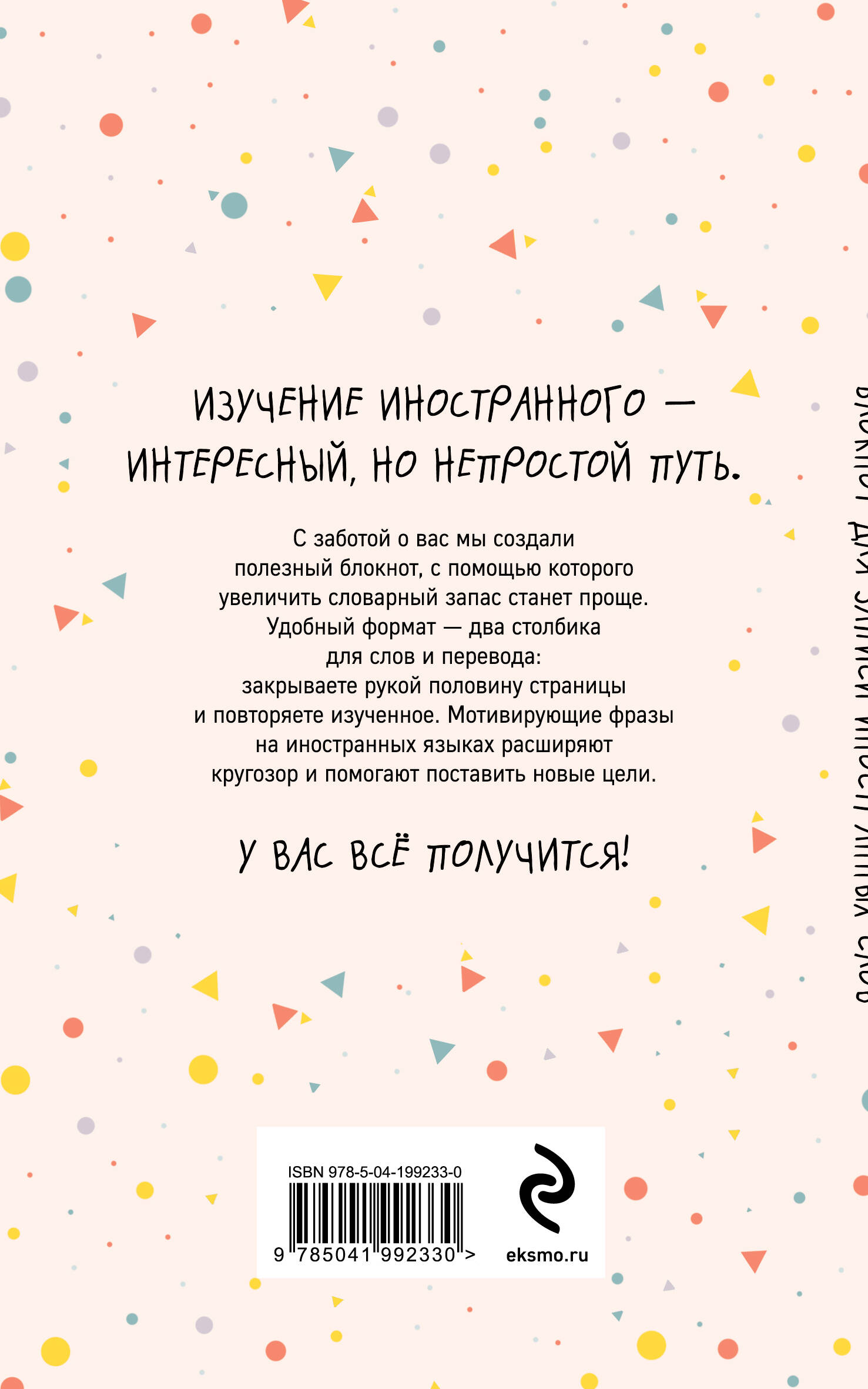Большой словарный запас - ключ к общению на иностранном языке. Стильный и удобный блокнот создан для тех, кто стремится к совершенству. С помощью удобной структуры - два столбика для записи слов и перевода - вы сможете легко выучить новую лексику, нужно только закрыть рукой половину листа. Скругленные уголки надолго сохранят обложку в целости, а белая качественная бумага внутри будет радовать глаз. В блокноте вы также найдете мотивирующие фразы на разных языках, они помогут расширить кругозор и поставить новые цели.| Издательство | ООО "Издательство "Эксмо" |