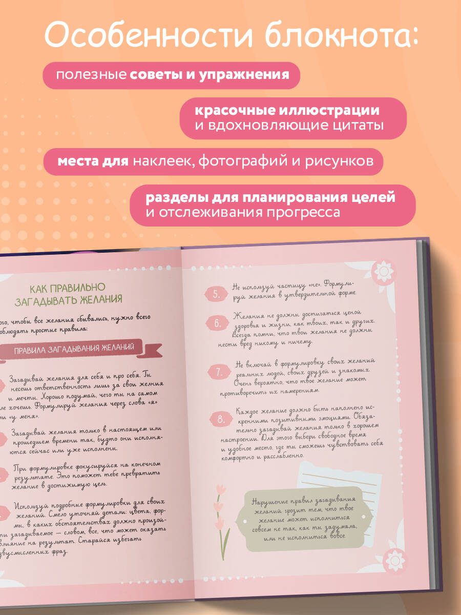Добро пожаловать в волшебный мир самых заветных мечтаний и фантазий! Каждой девочки! Этот блокнот желаний создан специально для юных мечтательниц, которые хотят записать свои самые смелые планы и сокровенные цели. Здесь девочка найдет множество ярких страниц, на которых можно формулировать свои желания, ставить себе цели, делать зарисовки, а также делиться своими мыслями и переживаниями. Направляющие вопросы и задания помогут каждой девочке лучше узнать себя, понять, чего она на самом деле хочет и как этого достичь. Этот блокнот - не магическая книга, но он создает все условия для того, чтобы желания начали исполнятся. Прямо как по волшебству! Особенности блокнота: - Красочные иллюстрации и вдохновляющие цитаты для поддержания позитивного настроя. - Полезные советы и упражнения для развития творческого потенциала. - Специальные разделы для планирования целей и отслеживания прогресса. - Места для наклеек, фотографий и рисунков, чтобы сделать каждый блокнот уникальным и индивидуальным. Этот блокнот для каждой девочки станет надежным спутником в захватывающем путешествии по миру мечтаний и фантазий. С его помощью каждая сможет не только лучше узнать себя, но и превратить свои мечты в реальность. Ведь все большие достижения начинаются с маленьких шагов и великой веры в себя!| Издательство | ООО "Издательство "Эксмо" |