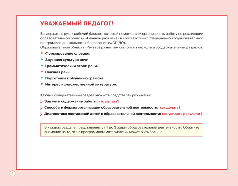 Блокнот педагога подготовительной группы детского сада предназначен для организации работы по образовательной области «Речевое развитие» в соответствии с Федеральной образовательной программой дошкольного образования (ФОП ДО). Каждый раздел блокнота содержит в себе копилку способов и приёмов взаимодействия, игры, образовательные ситуации, тематики бесед, проектов для детей подготовительной группы. Пособие нацелено на помощь педагогу в работе с детьми 6-7 лет и является дополнением к книге «Дошкольное образование. Путеводитель для педагога».| Издательство | Просвещение |