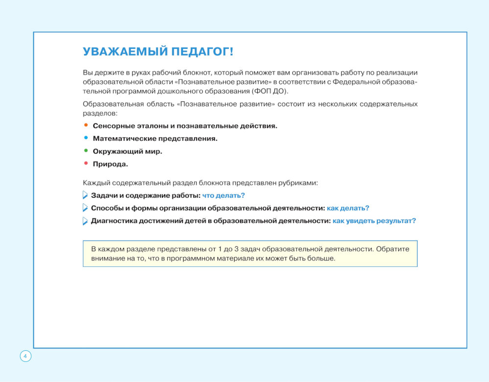 Блокнот педагога старшей группы детского сада предназначен для организации работы по образовательной области «Познавательное развитие» в соответствии с Федеральной образовательной программой дошкольного образования (ФОП ДО). Каждый раздел блокнота содержит в себе копилку способов и приёмов взаимодействия, игры, образовательные ситуации, тематики бесед, проектов для детей старшей группы. Пособие нацелено на помощь педагогу в работе с детьми 5-6 лет и является дополнением к книге «Дошкольное образование. Путеводитель для педагога».