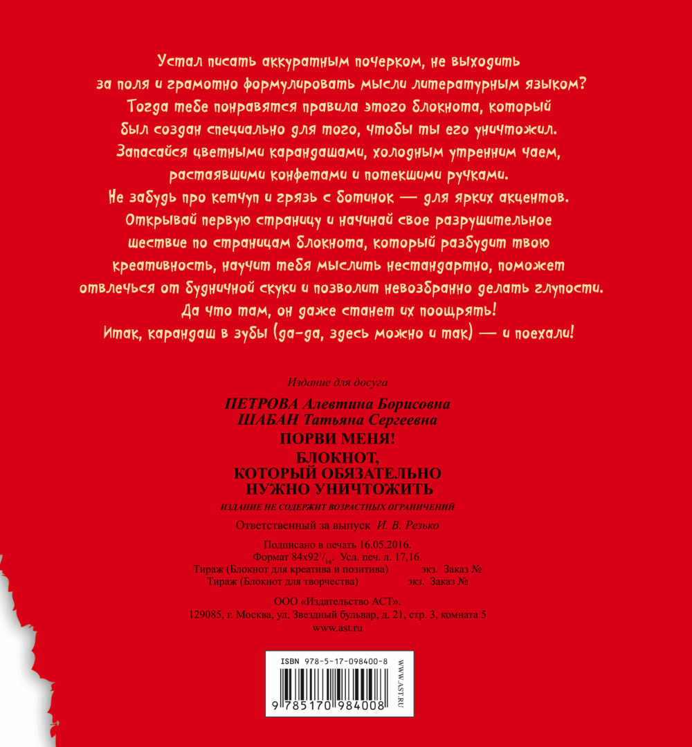 Устал писать аккуратным почерком, не выходить за поля и грамотно формулировать мысли литературным языком? Тогда тебе понравятся правила этого блокнота, который был создан специально для того, чтобы ты его уничтожил. Запасайся цветными карандашами, холодным утренним чаем, растаявшими конфетами и потекшими ручками. Не забудь про кетчуп и грязь с ботинок - для ярких акцентов. Открывай первую страницу и начинай свое разрушительное шествие по страницам блокнота, который разбудит твою креативность, научит тебя мыслить нестандартно, поможет отвлечься от будничной скуки и позволит невозбранно делать глупости. Да что там, он даже станет их поощрять! Итак, карандаш в зубы (да-да, здесь можно и так) - и поехали!