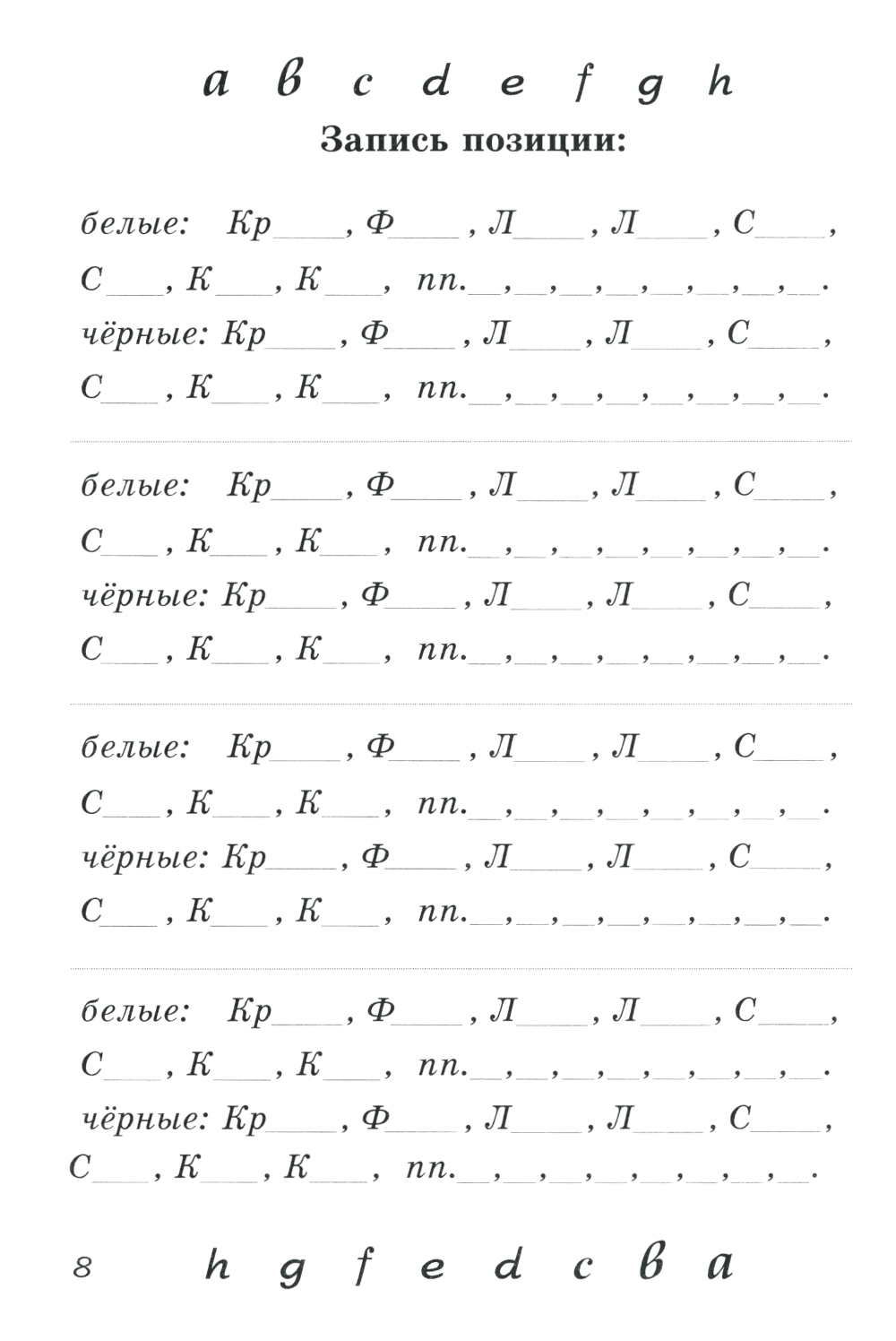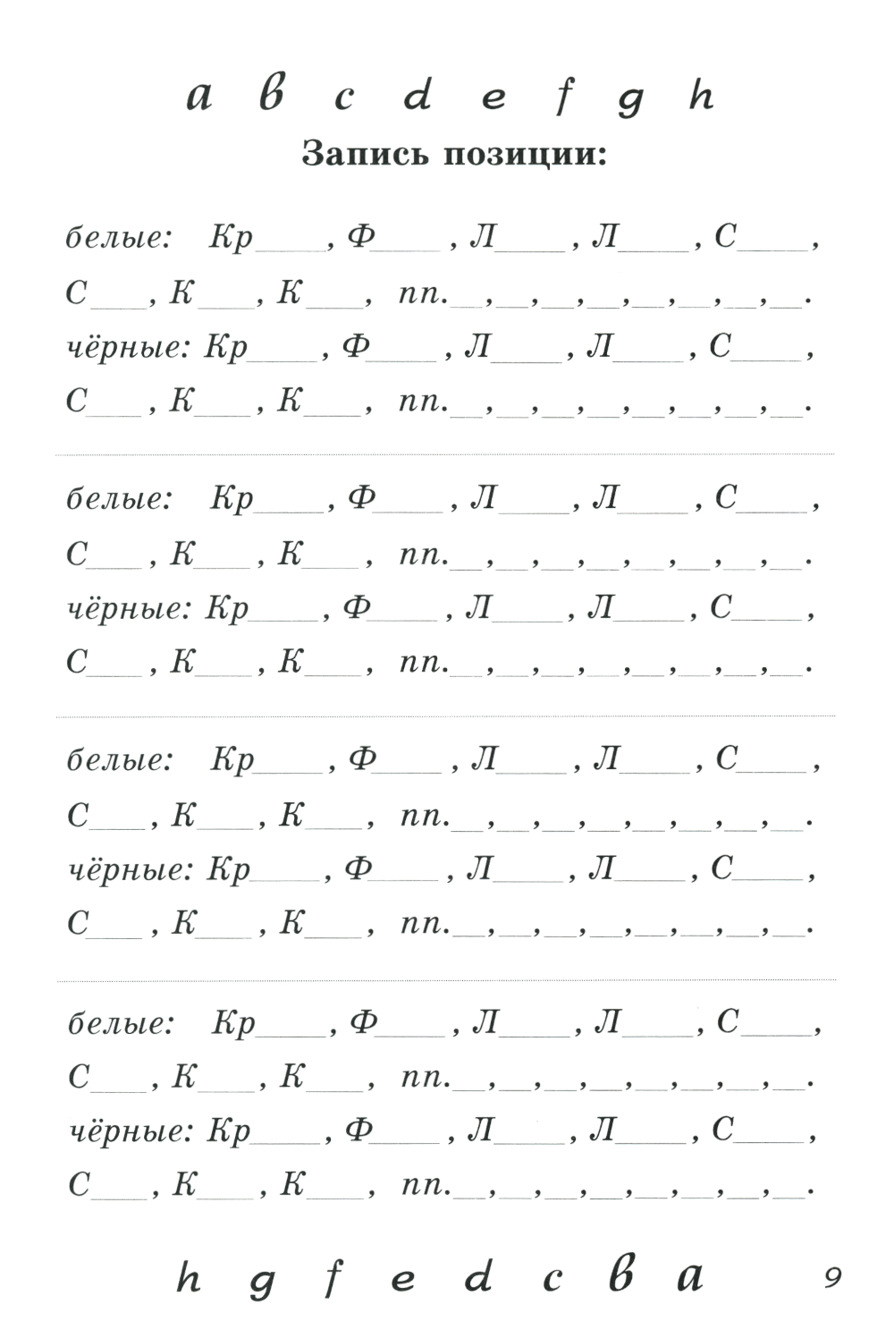 Вначале блокнот очень похож на прописи. На первых страницах ребенок научится записывать новые шахматные буквы и фигуры. Далее следуют страницы для записи партий. Кроме того, в этом блокноте ребенок найдет: страницы для записи решения задач; страницы для записи уроков и выполнения домашних заданий; турнирную таблицу и карточку участника; шахматные правила и выдержки из правил шахмат ФИДЕ; сведения о всех чемпионах мира.| Издательство | Изд.Калиниченко |