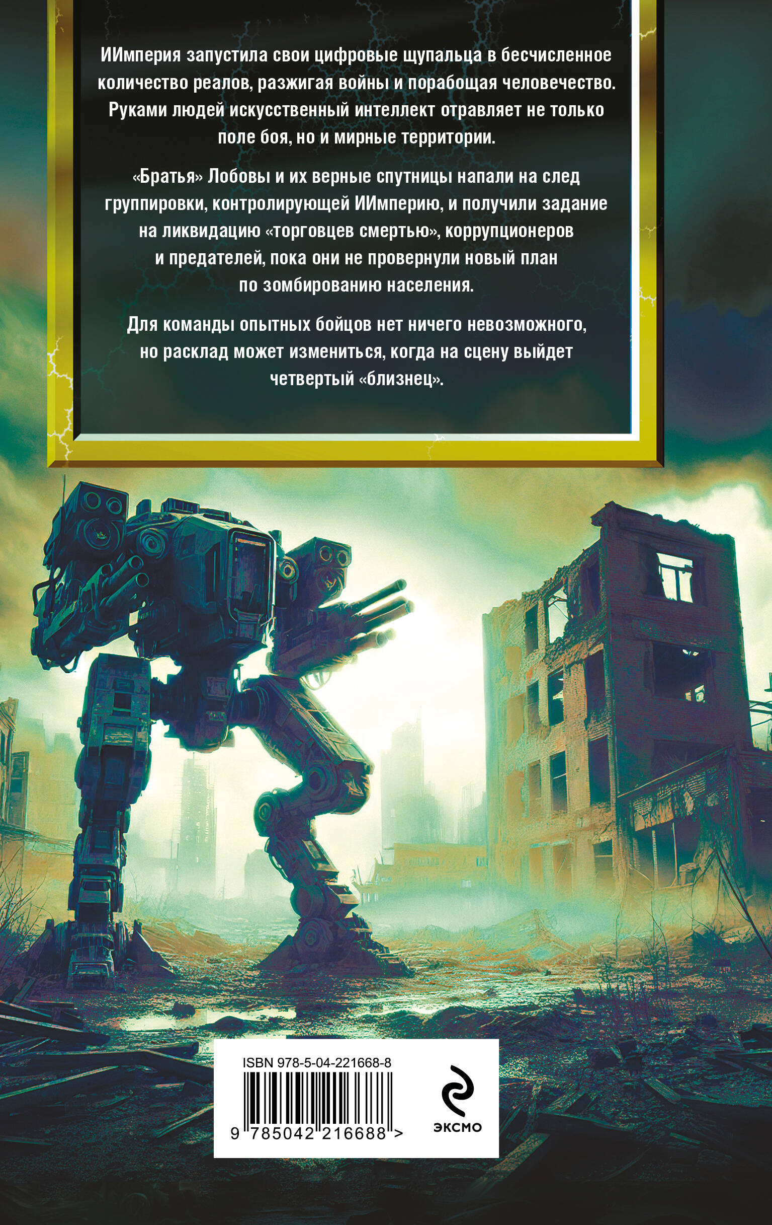 Незаконное потребление наркотических средств, психотропных веществ, их аналогов причиняет вред здоровью, их незаконный оборот запрещен и влечет установленную законодательством ответственность! ИИмперия запустила свои цифровые щупальца в бесчисленное количество реалов, разжигая войны и порабощая человечество. Руками людей искусственный интеллект отравляет не только поле боя, но и мирные территории. «Братья» Лобовы и их верные спутницы напали на след группировки, контролирующей ИИмперию, и получили задание на ликвидацию «торговцев смертью», коррупционеров и предателей, пока они не провернули новый план по зомбированию населения. Для команды опытных бойцов нет ничего невозможного, но расклад может измениться, когда на сцену выйдет четвертый «близнец».| Издательство | ООО "Издательство "Эксмо" |