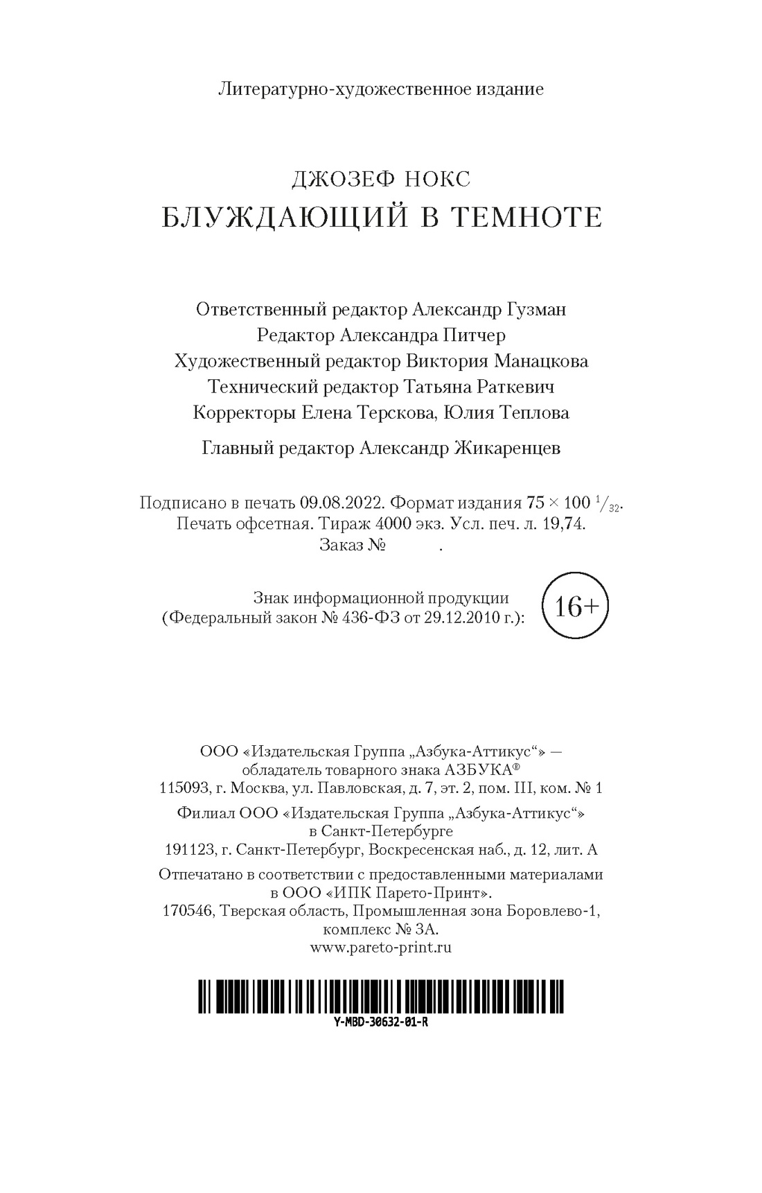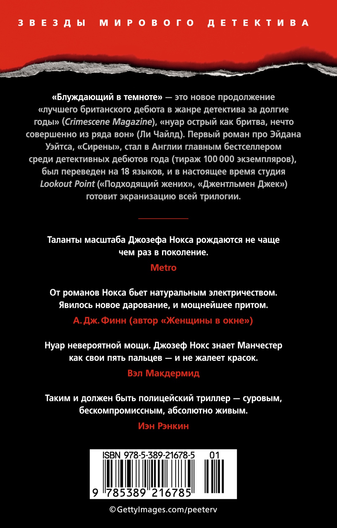 «Блуждающий в темноте» - это новое продолжение «лучшего британского дебюта в жанре детектива за долгие годы» (Crimescene Magazine), «нуар острый как бритва, нечто совершенно из ряда вон» (Ли Чайлд). Первый роман про Эйдана Уэйтса, «Сирены», стал в Англии главным бестселлером среди детективных дебютов года (тираж 100 тысяч экземпляров), был переведен на 18 языков, и в настоящее время студия Lookout Point («Подходящий жених», «Джентльмен Джек») готовит экранизацию всей трилогии. Детектив-констебль Эйдан Уэйтс и его напарник детектив-инспектор Сатклиф временно сняты с привычного ночного патрулирования. Им поручено дело поважнее: караулить у больничной койки доживающего последние дни Мартина Вика - массового убийцу, окрещенного журналистами Лунатиком. Вик утверждает, что не помнит, как убивал, - якобы уже очнулся весь в крови; отсюда и прозвище. Но когда отключение электричества погружает больницу (а с ней и полгорода) во тьму, неизвестный злоумышленник совершает дерзкий налет на тщательно охраняемую палату Вика - и последние слова Лунатика отправляют Эйдана Уэйтса на поиски самого настоящего сердца тьмы... «Джозеф Нокс - главная надежда британского криминального романа, а "Блуждающий в темноте" - возможно, лучшая его книга» (The Times).