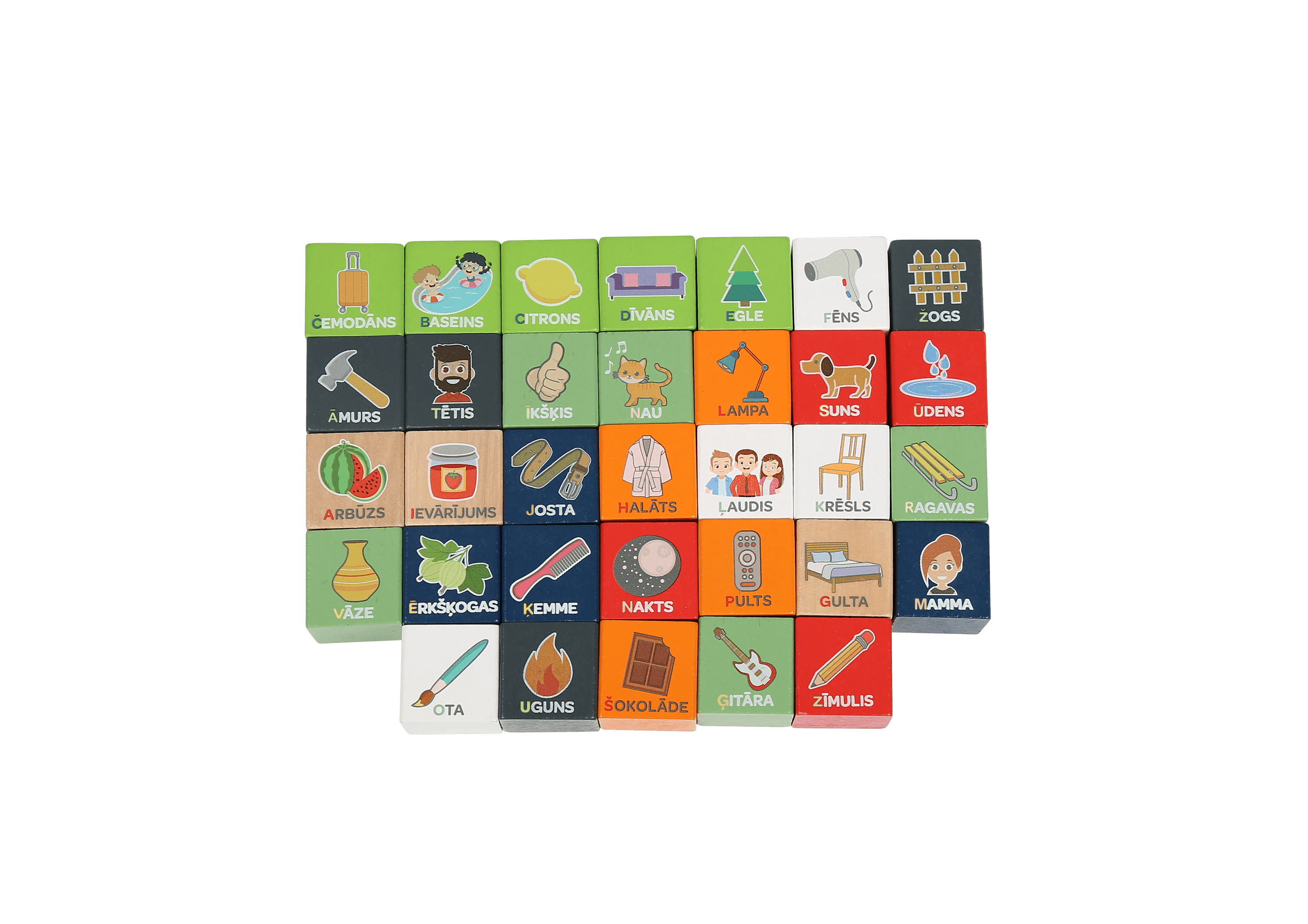 Развивающие деревянные кубики «АЛФАВИТ И СЛОВА» знакомит ребенка с миром букв и слов, учит латышскому алфавиту и развивает умение связывать буквы с изображениями. Этот комплект - отличный первый шаг в обучении чтению.