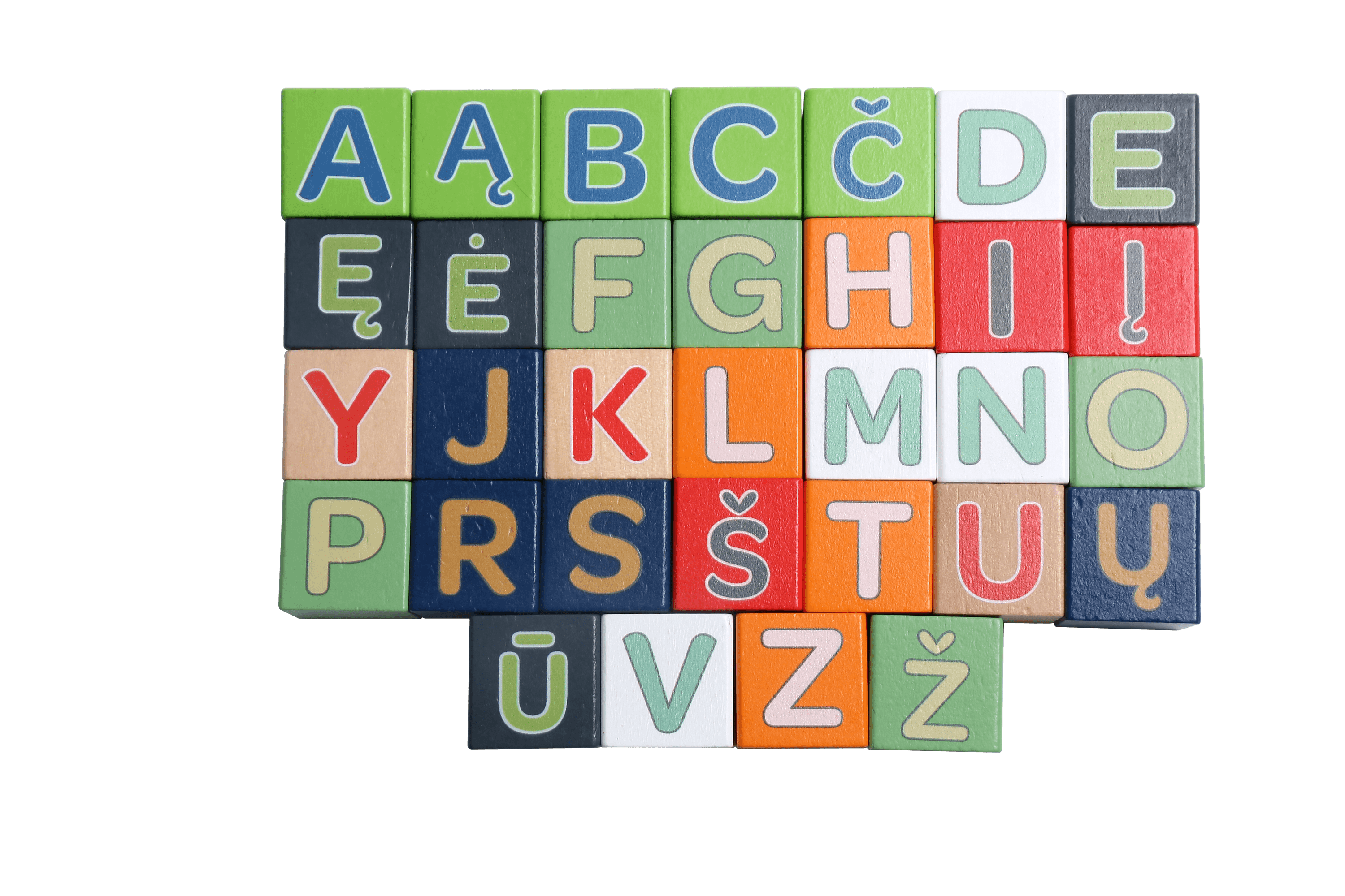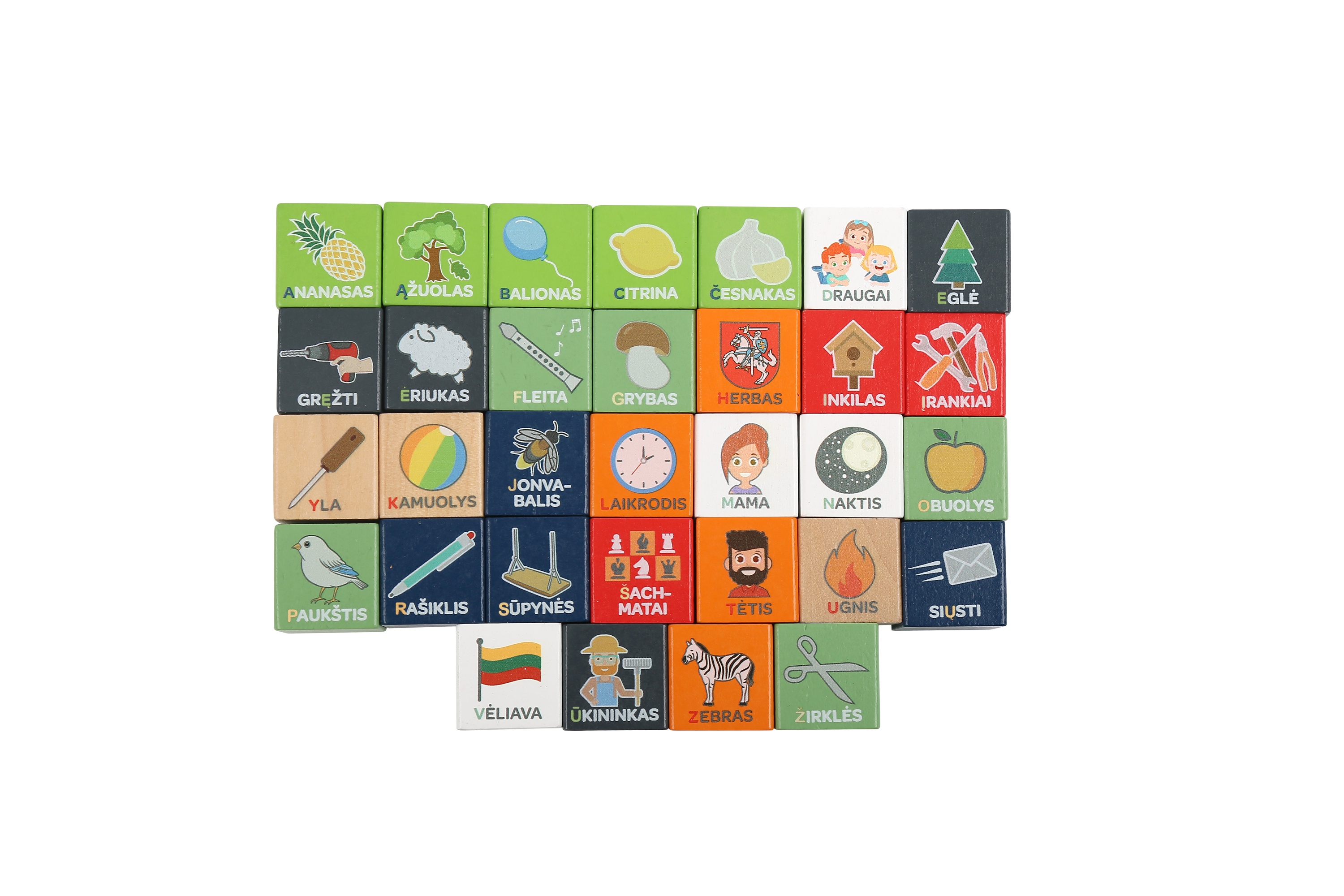 Развивающие bo. деревянные кубики «АЛФАВИТ И СЛОВА» знакомит ребенка с миром букв и слов, учит литовскому алфавиту и развивает умение связывать буквы с изображениями. Этот комплект - отличный первый шаг в обучении чтению.