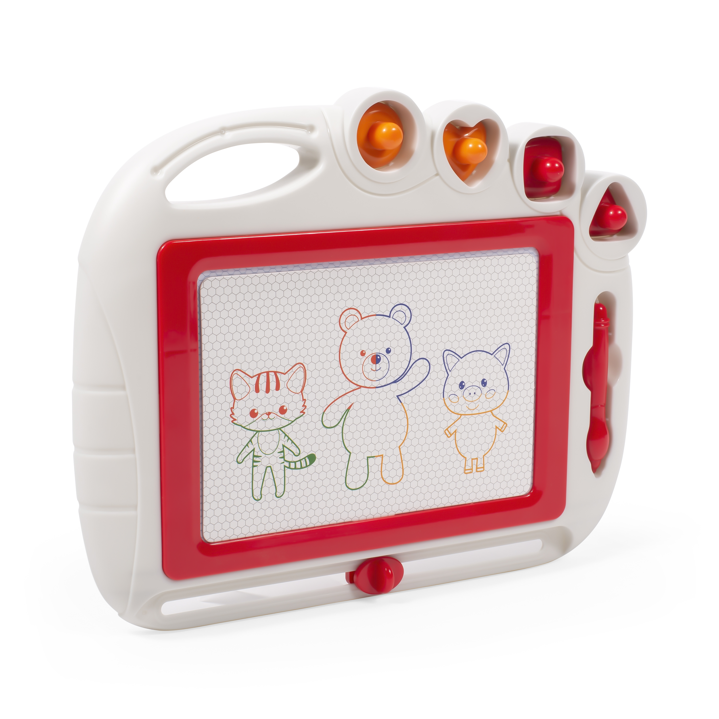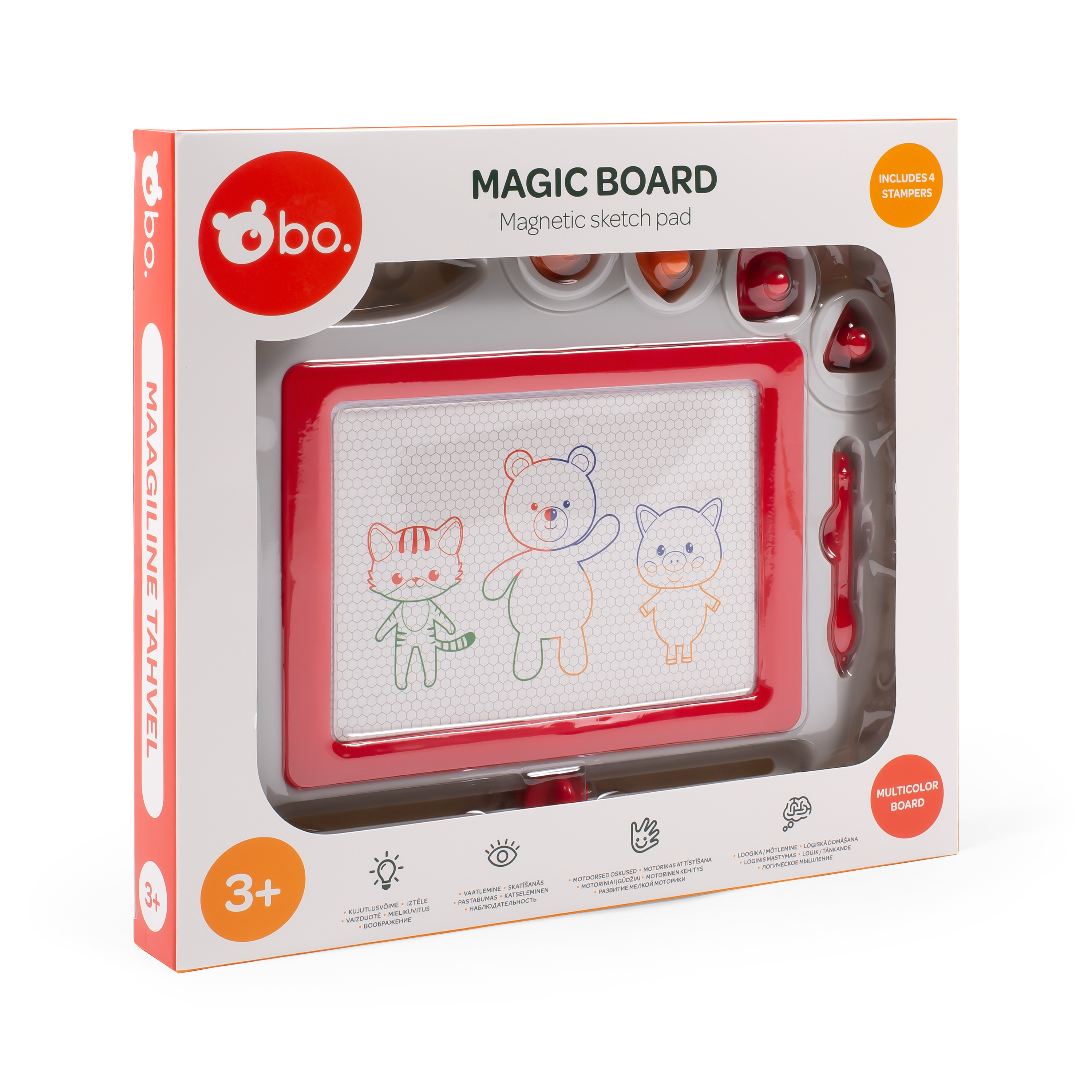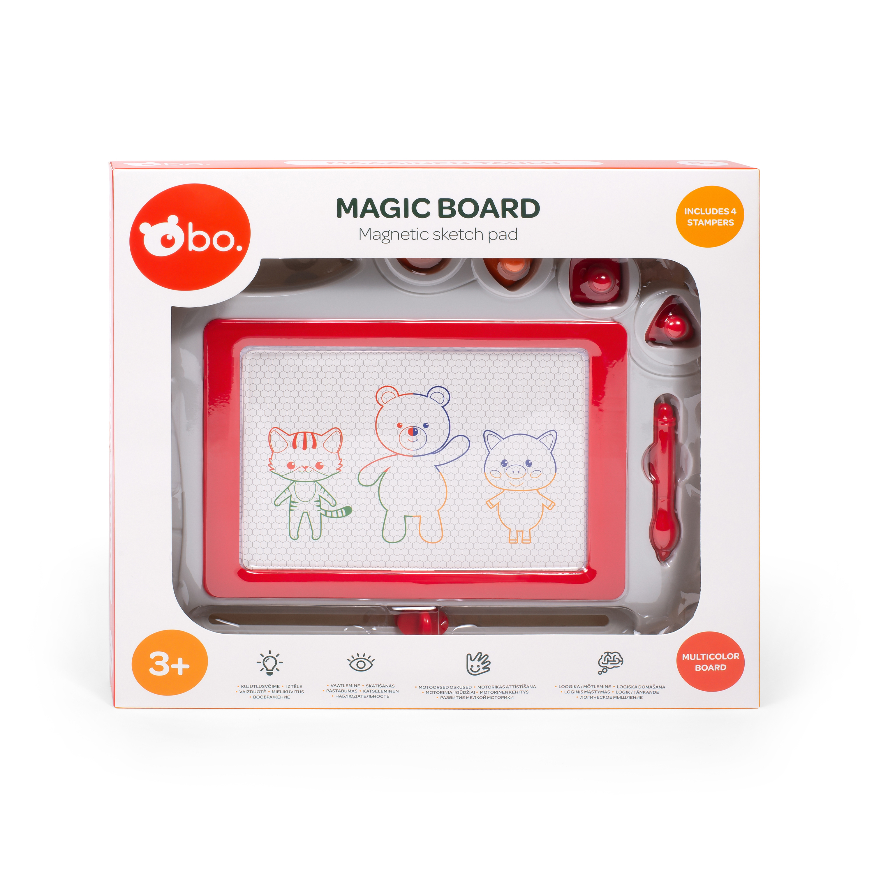 Эта магнитная доска для рисования bo. познакомит ребенка с миром искусства! Просто возьмите магнитный карандаш и начните рисовать, а затем сотрите рисунок несколькими движениями! Четыре магнитных штампа и четырехцветный фон сделают рисование еще более увлекательным! Компактный размер 27x22 см делает доску идеальным спутником в любой поездке!