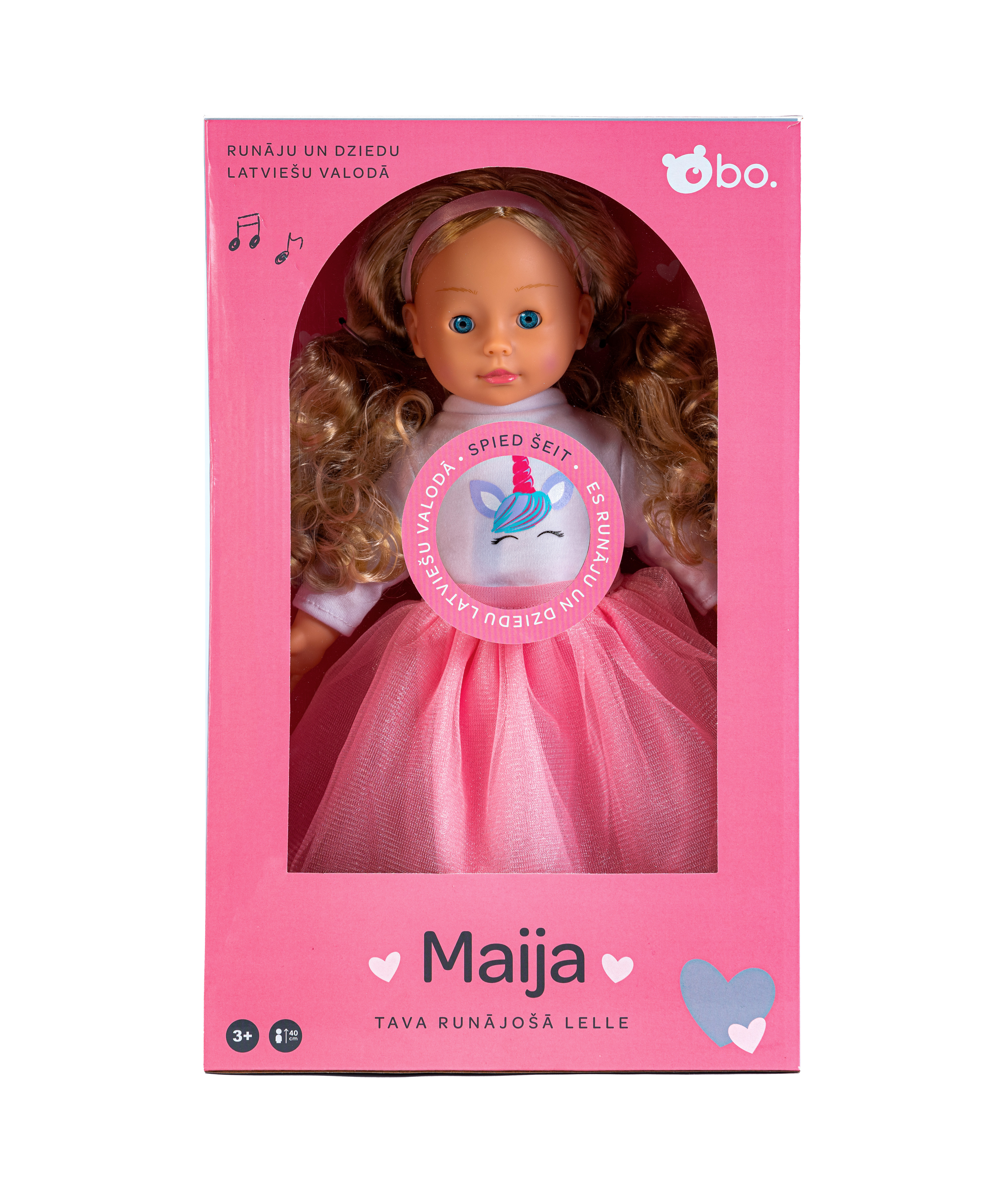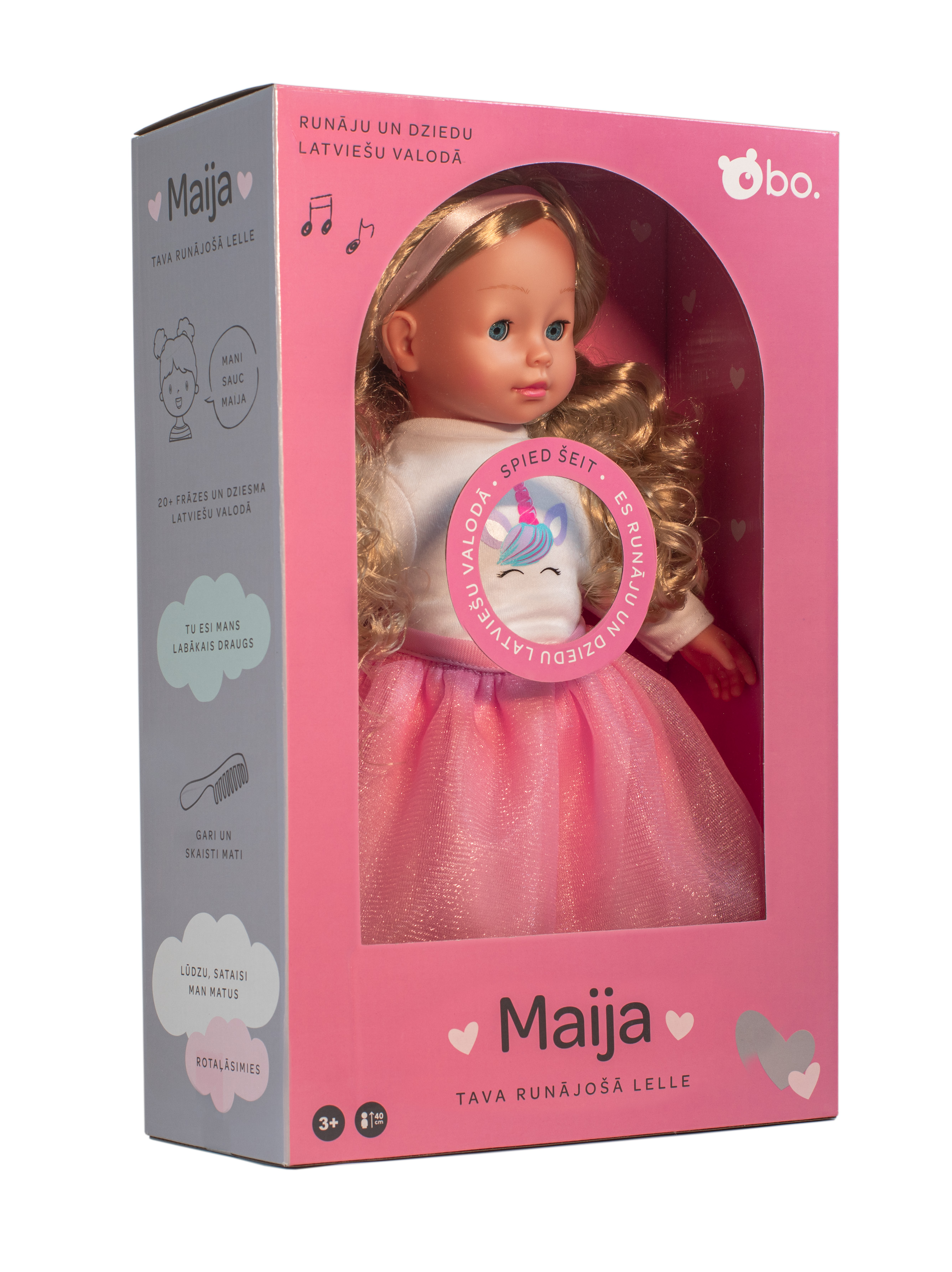 Добро пожаловать в милый мир друзей bo., где никогда не заканчиваются веселые беседы и игры! Посмотрите на говорящую куклу Маю, которая станет вашим новым очаровательным другом! У нее длинные светлые волосы, которые можно причесать, и красивые голубые глаза. Она одета в стильную розовую юбку, белую рубашку с фиолетовым принтом единорога, маленькие милые розовые туфельки и посмотрите, какая красивая повязка на вьющихся волосах! Кукла говорит на латышском языке более 20 фраз, а также споет вам песню. Нажмите ей на живот, чтобы услышать ее прелестную речь! Расчесывай и укладывай ей волосы, обнимай ее, играй с ней, разговаривай с ней - все это о кукле Мая, твоей новой говорящей подруге! Говорящая кукла Мая ростом 40 см.