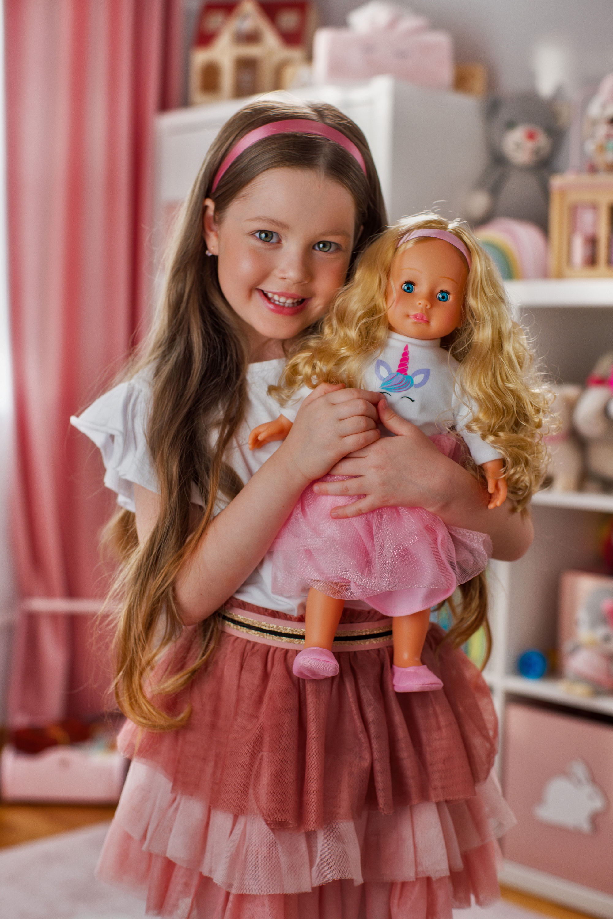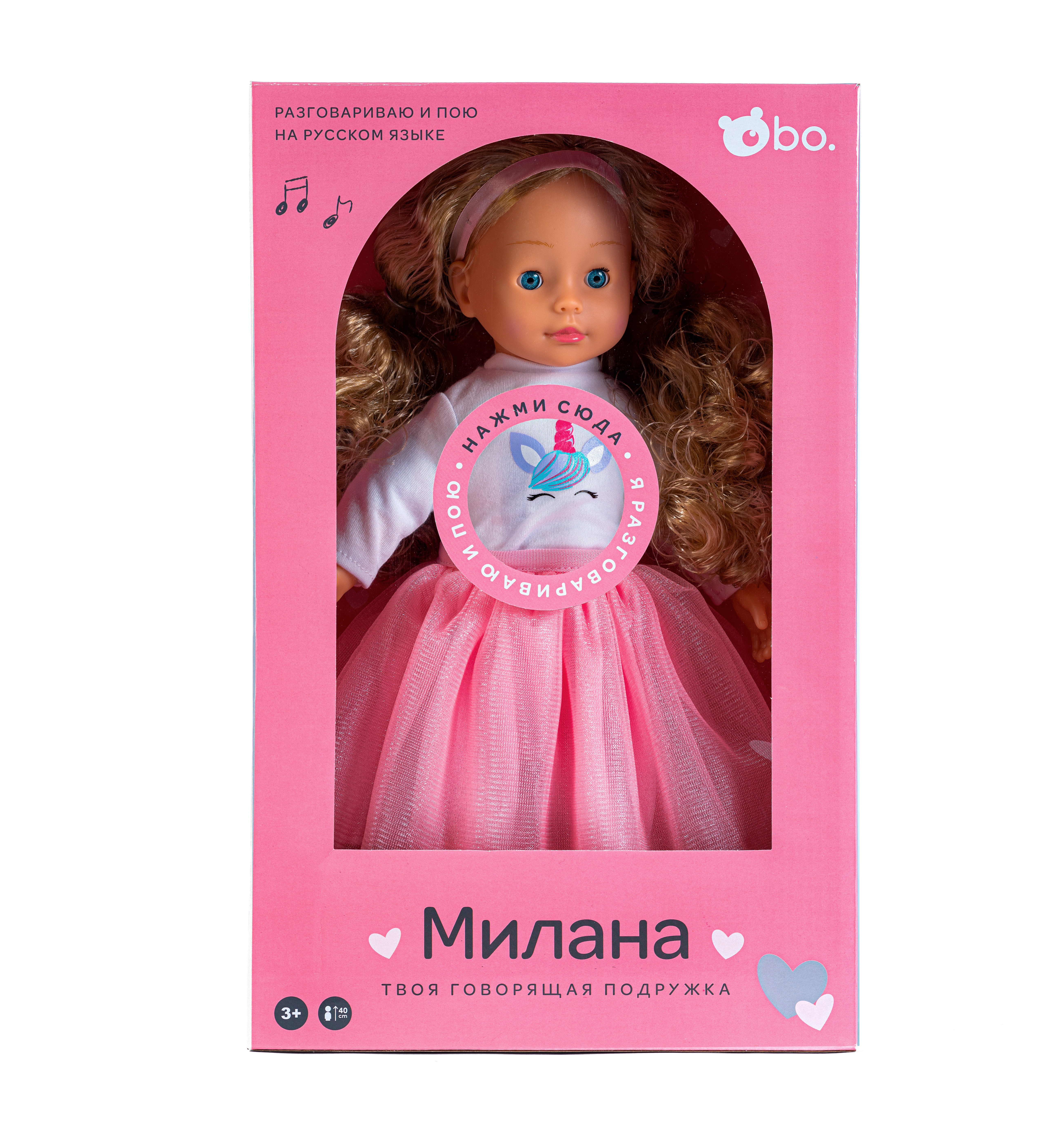 Добро пожаловать в милый мир друзей bo., где веселые разговоры и творческие игры никогда не заканчиваются! Посмотрите на говорящую куклу Милану - вашу новую очаровательную подругу! У нее длинные расчесываемые светлые волосы, из которых можно сделать множество причесок, и красивые спящие голубые глаза. Она одета в стильную розовую юбку, белую рубашку с фиолетовым принтом единорога, маленькие милые розовые туфельки и посмотрите, какая красивая повязка на ее кудрявых волосах! Кукла разговаривает на русском языке более чем 20 фразами и споет вам песенку. Нажмите на ее мягкий животик, чтобы услышать ее милую речь! Расчесывайте и укладывайте ей волосы, обнимайте ее, играйте с ней, разговаривайте с ней - все это о кукле Милане, вашей новой говорящей подруге! Высота говорящей куклы Миланы - 40 см.