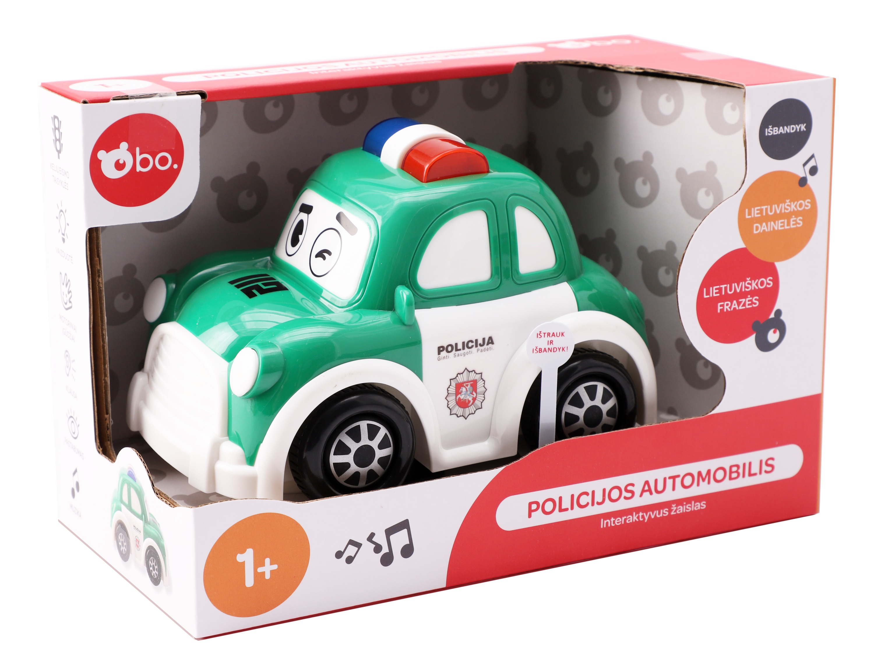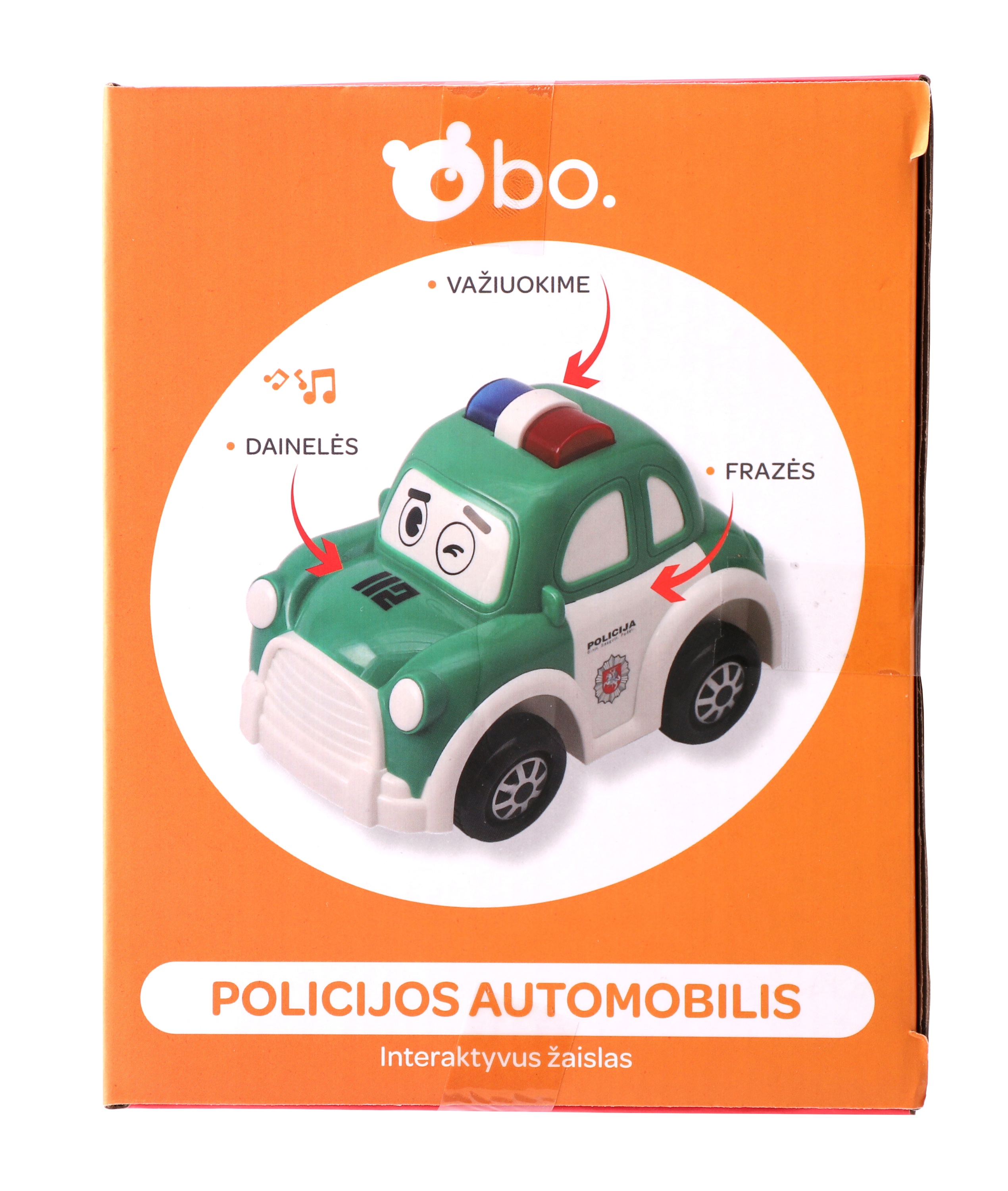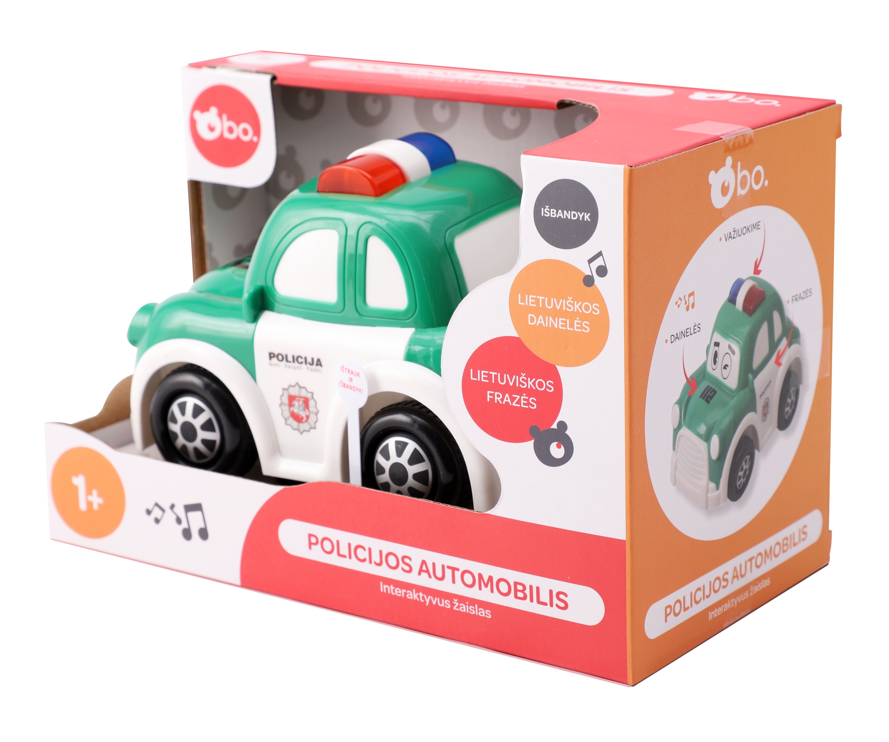 Эта интерактивная полицейская машина bo. станет идеальной первой машинкой для вашего малыша! Благодаря датчикам, машина будет продолжать двигаться, пока вы не остановите ее. Забавные звуки и световые эффекты делают ее интересной для маленьких детей. Нажмите на дверь, и машина начнет говорить по-литовски! Нажмите на капот, и вы сможете послушать 4 литовские песни.