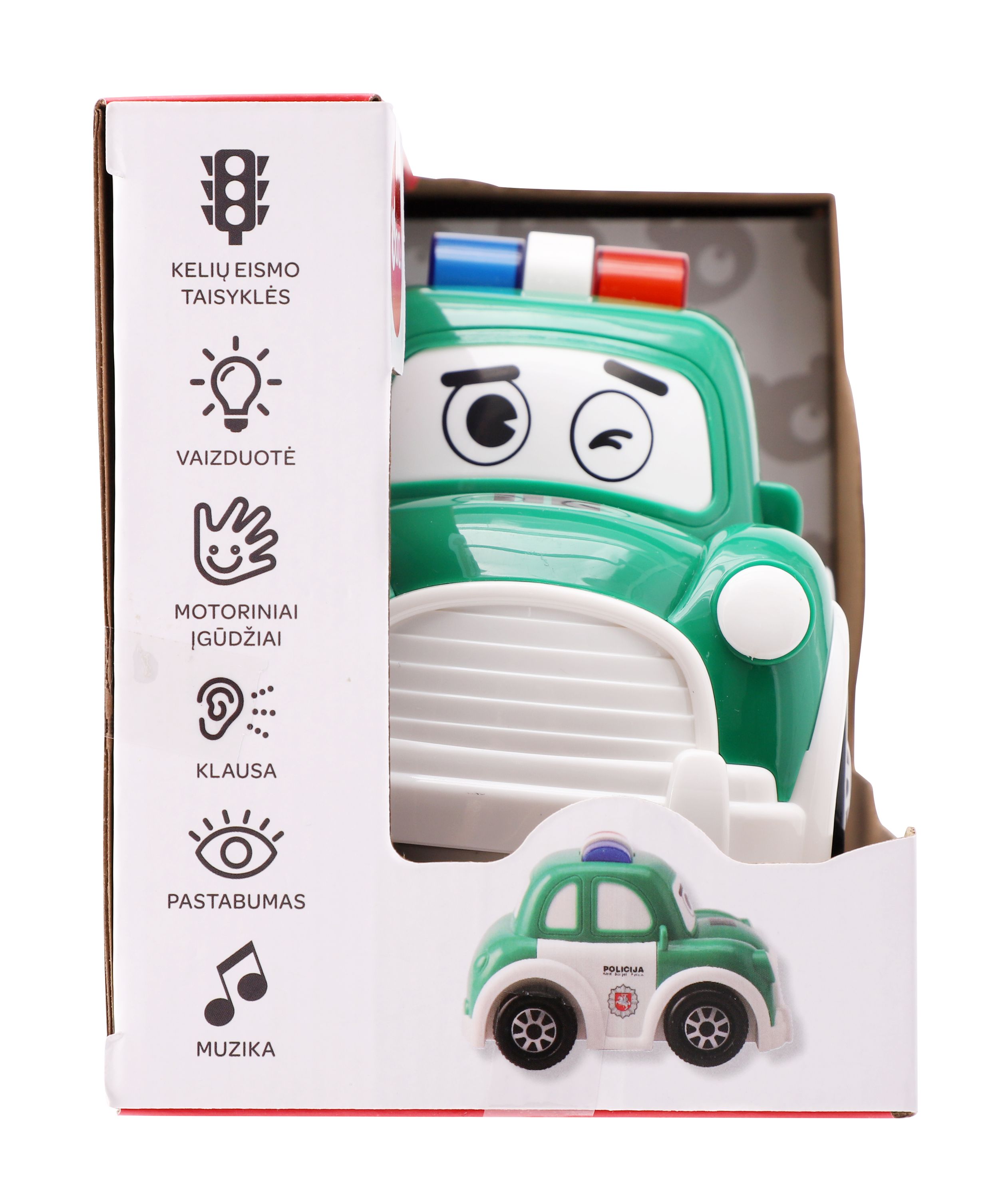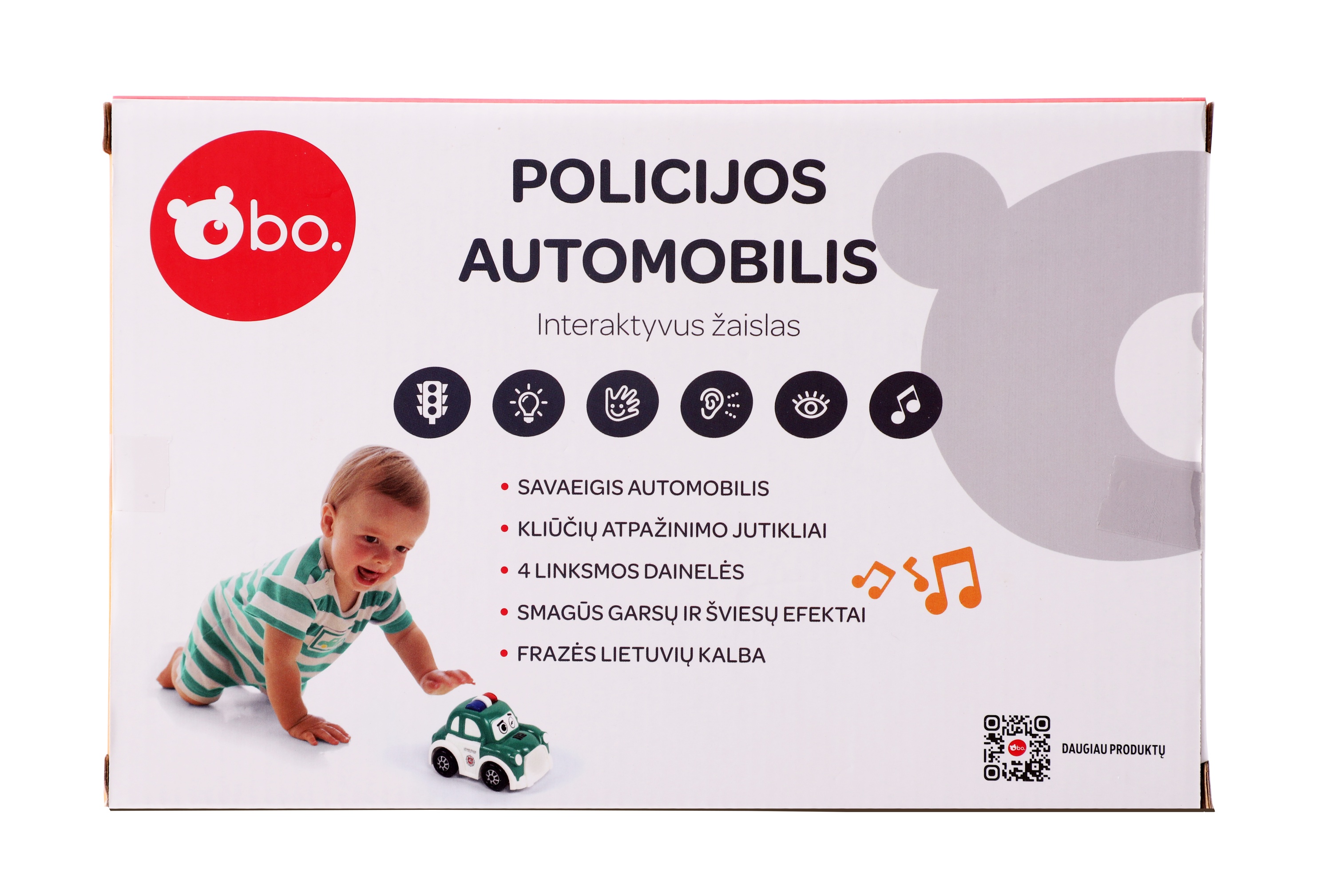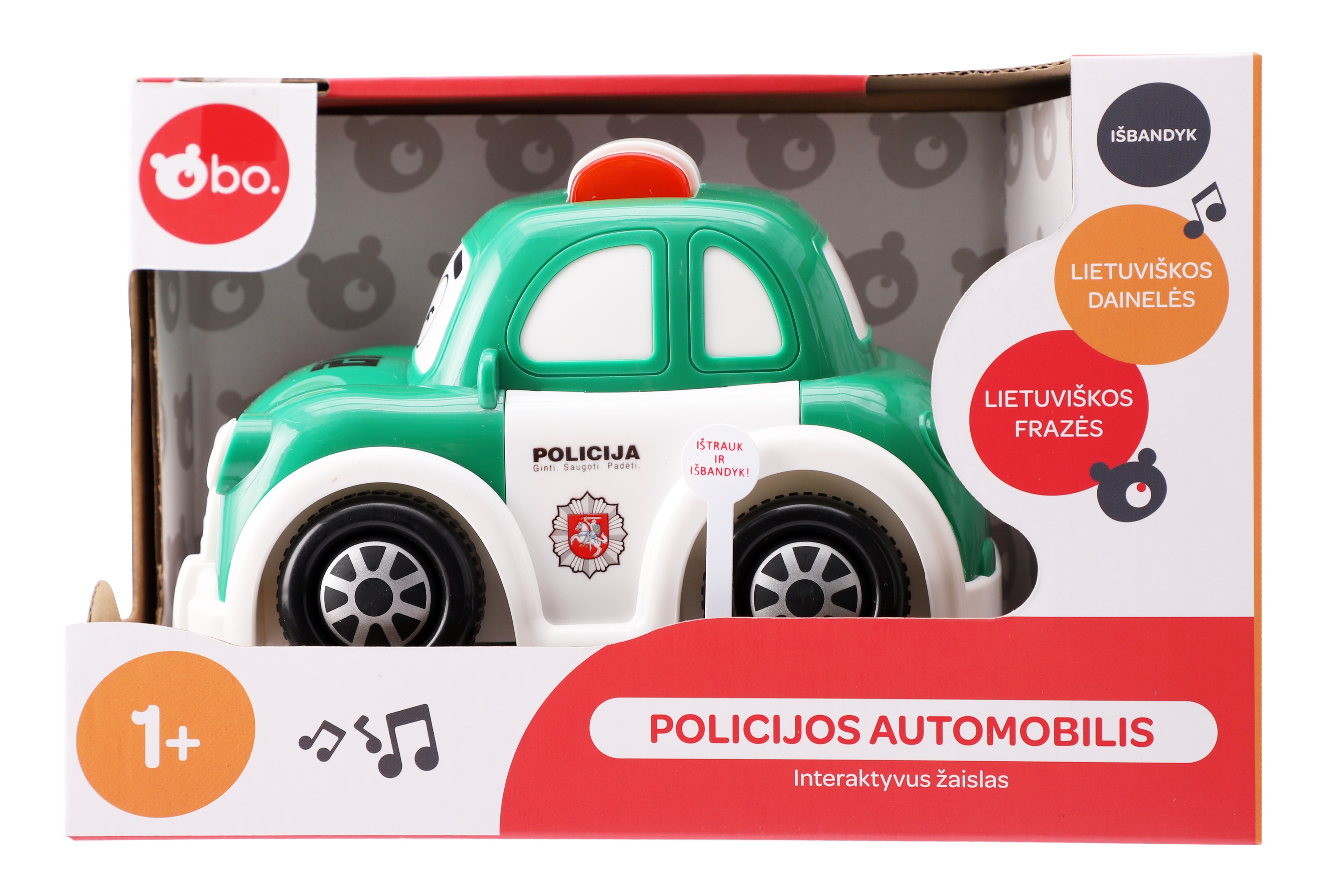 Эта интерактивная полицейская машина bo. станет идеальной первой машинкой для вашего малыша! Благодаря датчикам, машина будет продолжать двигаться, пока вы не остановите ее. Забавные звуки и световые эффекты делают ее интересной для маленьких детей. Нажмите на дверь, и машина начнет говорить по-литовски! Нажмите на капот, и вы сможете послушать 4 литовские песни.