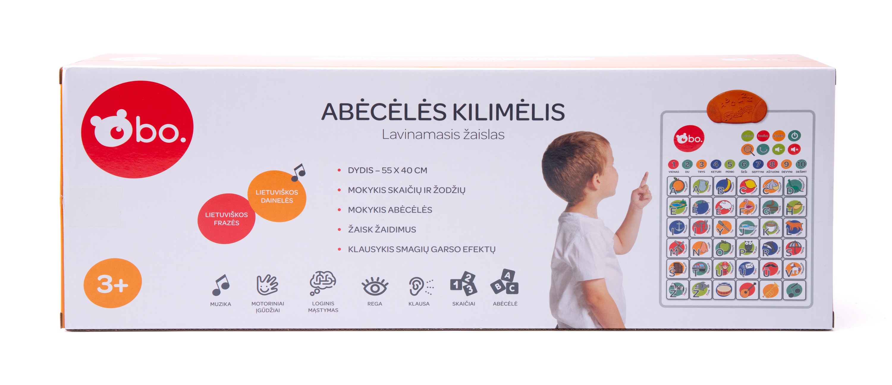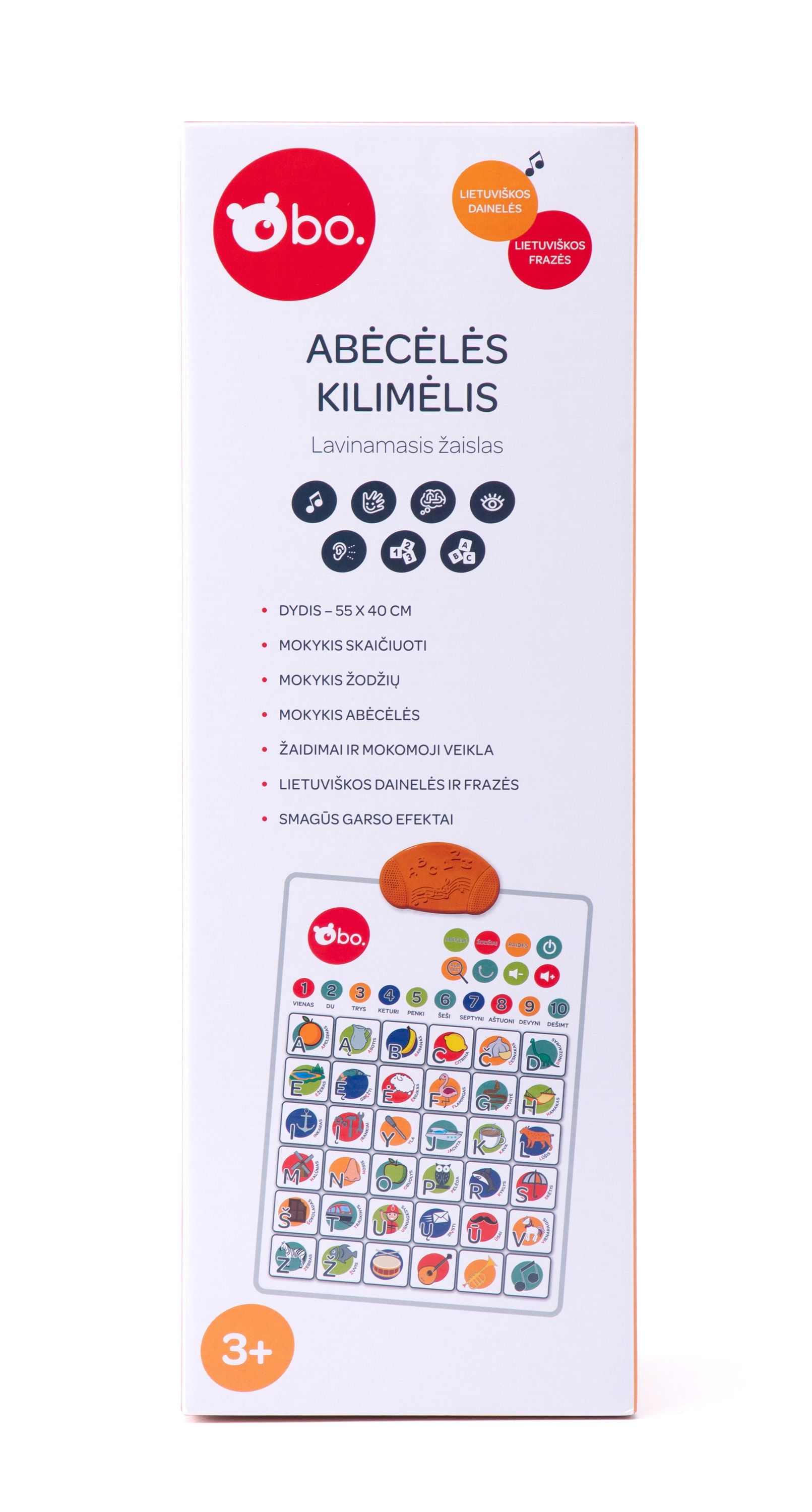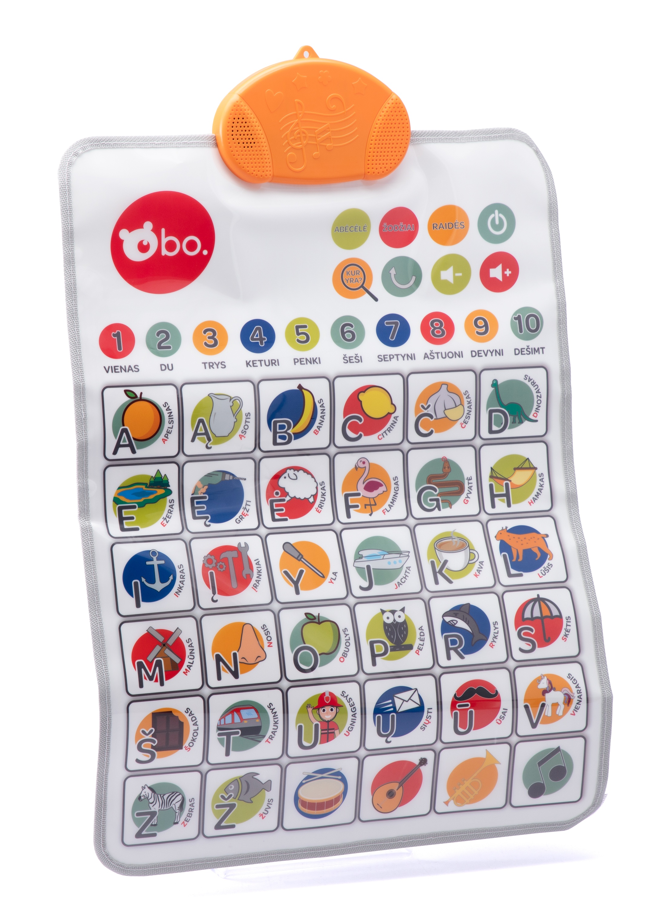 С этим развивающим матиком bo., который говорит на литовском языке, ваш ребёном сможет учить цифры, слова и алфавит! Включает в себя весёлую игру, где ребёнок должен будет найти правильное слово, цифру или букву! Нажав на музыкальный инструмент, заиграют самые популярные детские песенки!