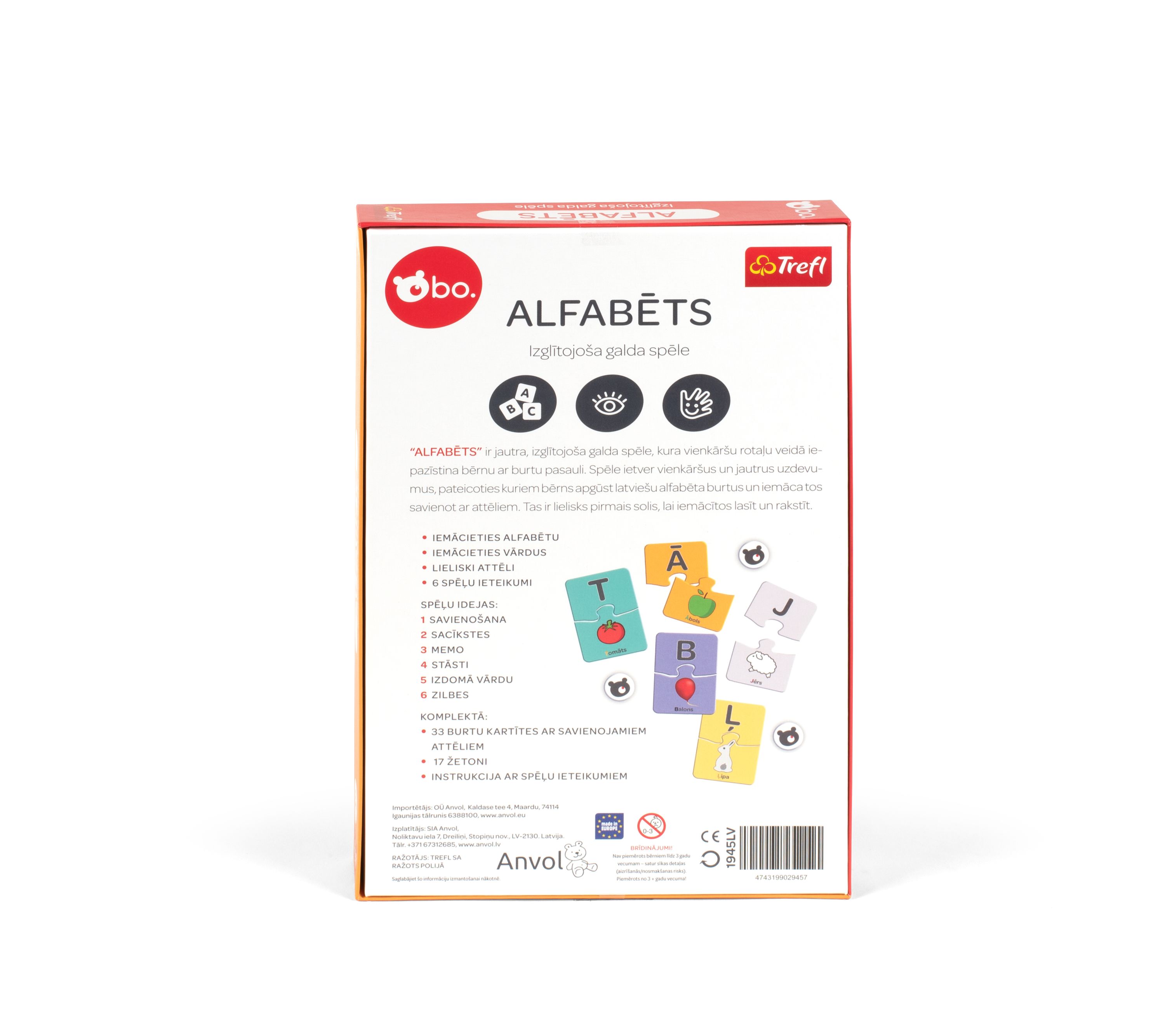 bo. "Алфавит" является образовательной головоломкой, которая знакомит ребенка с миром букв через забавную игру. Игра содержит простые и веселые задания, во время которых ребенок узнает буквы латышского алфавита и будет сопоставлять их с картинками. Эта игра является отличным первым шагом к самостоятельному чтению и письму.