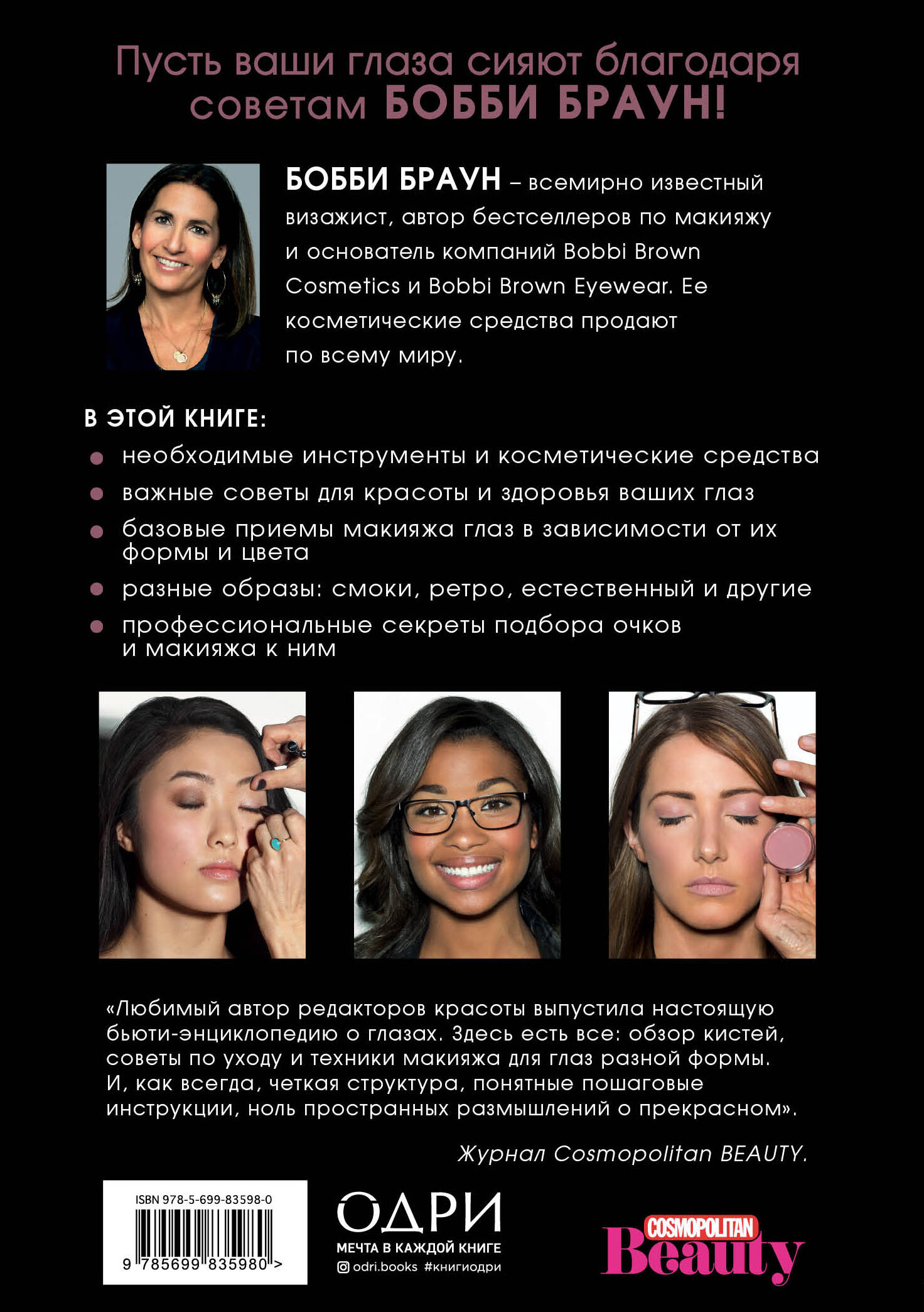 Если речь идет о великолепном макияже глаз, то правильно подобранные инструменты и техника нанесения имеют значение. В этом руководстве, must have для любительниц макияжа, Бобби Браун, визажист с мировой известностью, покажет вам, с чего начать и как добиться потрясающего результата. Вы узнаете, какой макияж наилучшим образом подходит к форме и цвету ваших глаз. Пошаговые инструкции помогут вам создать естественный, мерцающий макияж, "смоки айз", мейкап "день-вечер" и множество других образов. Бобби Браун подскажет вам, как правильно подобрать очки к форме лица и цвету кожи. Ее советы помогут использовать мейкап так, чтобы он хорошо смотрелся с очками. В этом руководстве вы найдете вдохновляющие и подробные инструкции, которые научат вас создавать эффектные образы и всегда выглядеть великолепно.| Издательство | ООО "Издательство "Эксмо" |