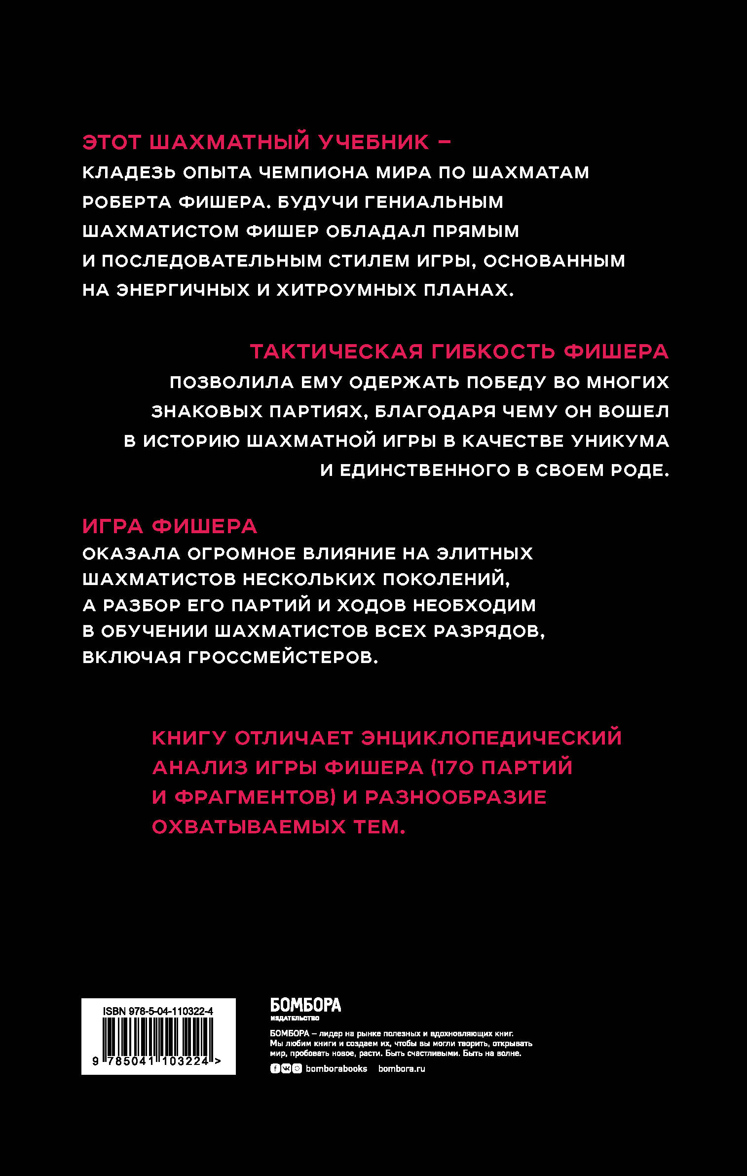 Этот шахматный учебник - эссенция опыта чемпиона мира по шахматам Роберта Фишера. Гениальный шахматист Роберт Фишер обладал прямым и последовательным стилем игры, основанным на кристально ясных энергичных планах. Это позволило ему выиграть множество «учебно-показательных» партий, напоминающих лекции по отдельным шахматным темам. Эти «лекции» оказали большое влияние на элитных шахматистов нескольких поколений, сегодня их необходимо использовать в обучении абсолютно всем, для чего данный учебник и предназначен. Книгу отличает полнота подбора примеров (170 партий и фрагментов) и широта охватываемых тем (есть даже глава, посвященная усилению игры в «блиц»). Работа с книгой повысит результаты шахматиста любой квалификации.| Издательство | ООО "Издательство "Эксмо" |
