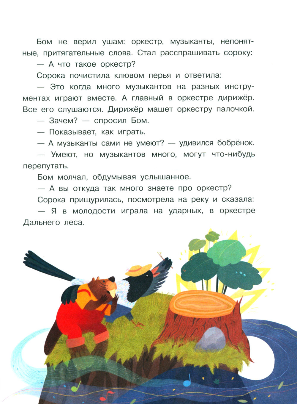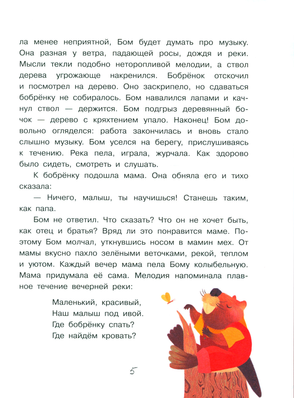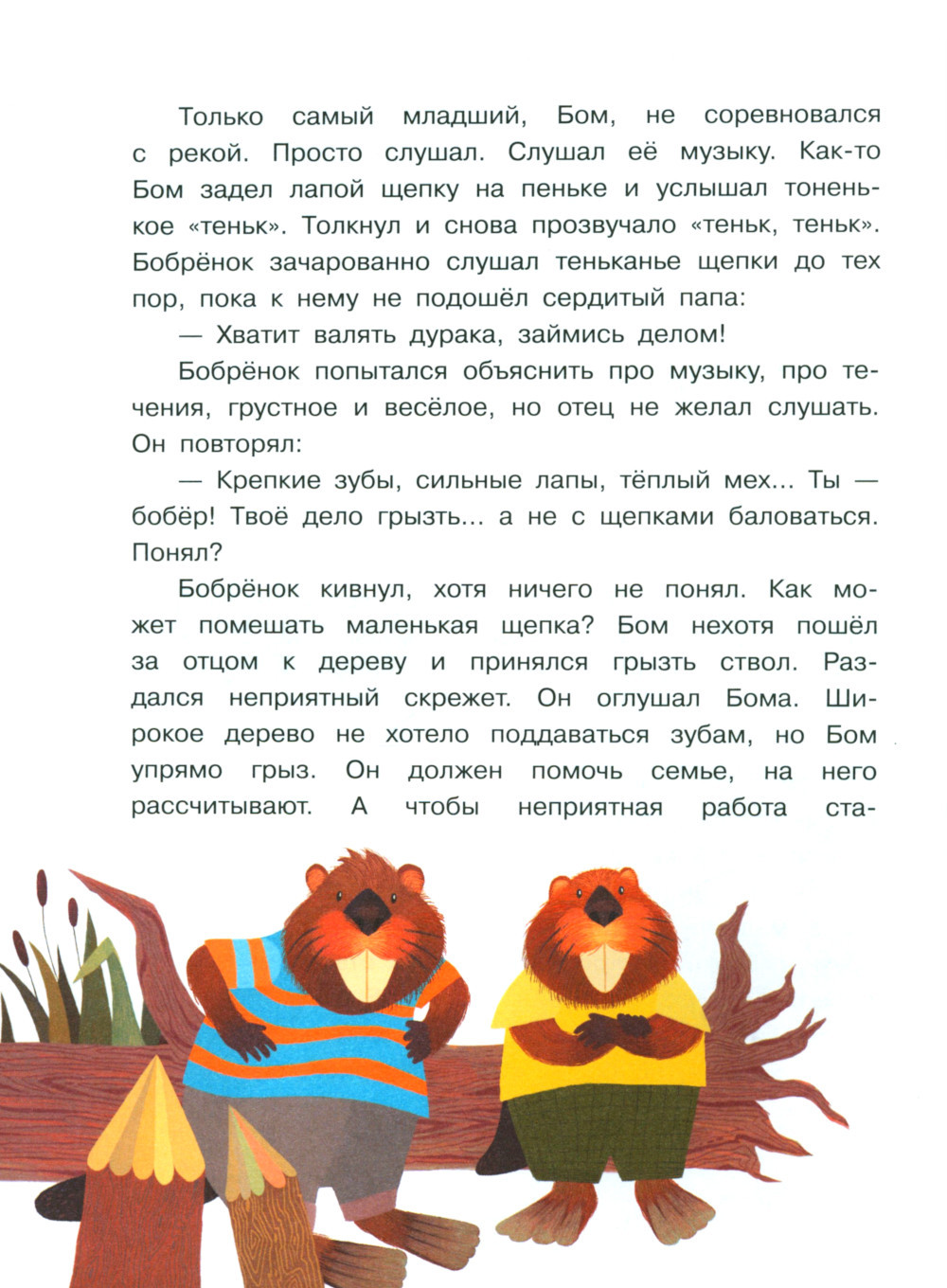 Это книга о бобрёнке по имени Бом, который живёт у реки с мамой, папой и двумя старшими братьями. Родители учат бобрят правильно грызть деревья и строить плотины, но Бома с детства больше увлекает музыка природы. Ему неинтересна бобровая рутина, он хочет стать музыкантом... По пути к своей мечте Бом встретится с разными препятствиями, которые ему придётся преодолеть самому. История покажет и докажет, что нужно не бояться мечтать и следовать зову своего сердца. Для старшего дошкольного возраста.| Издательство | Просвещение |