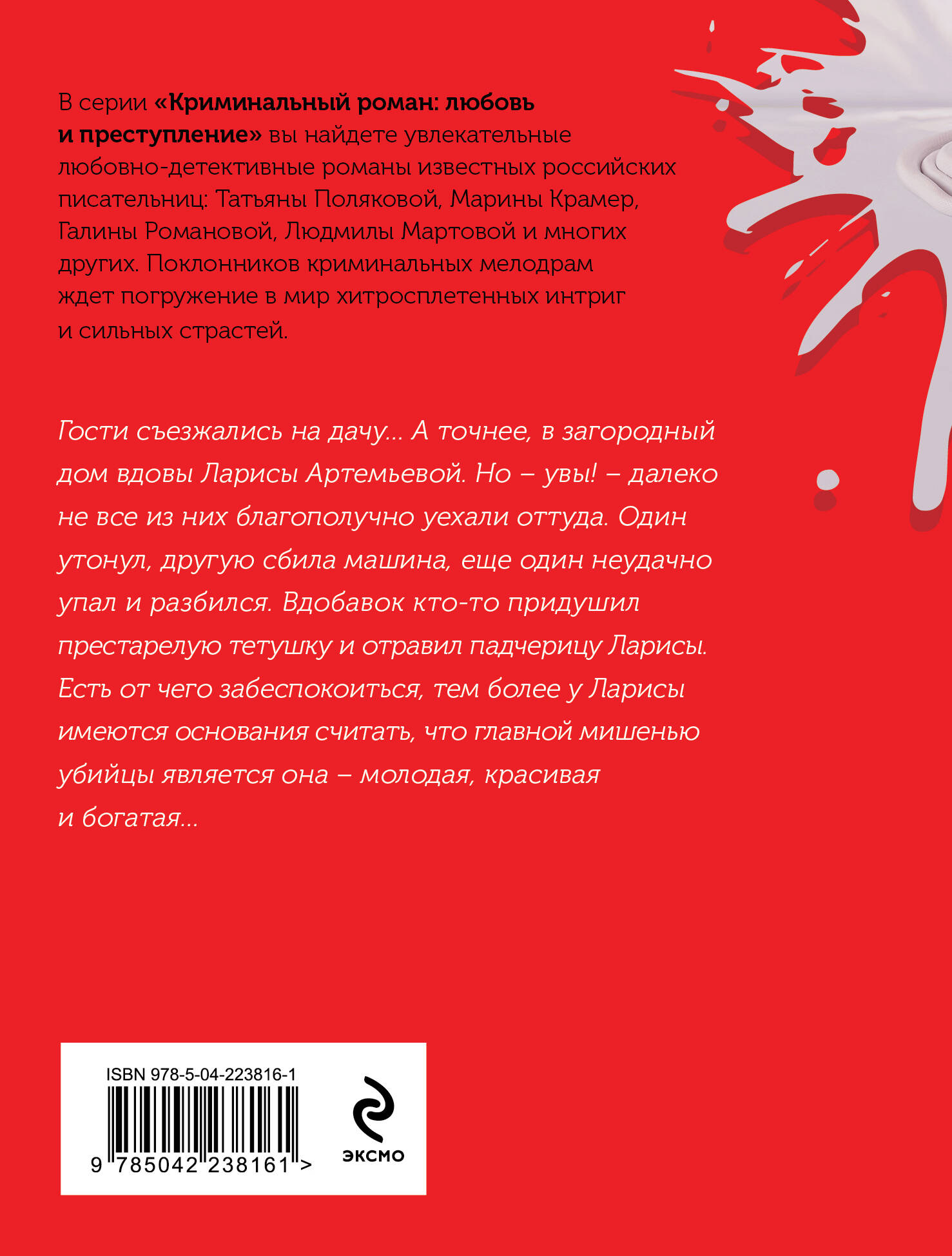 Гости съезжались на дачу… А точнее, в загородный дом вдовы Ларисы Артемьевой. Но - увы! - далеко не все из них благополучно уехали оттуда. Один утонул, другую сбила машина, еще один неудачно упал и разбился. Вдобавок кто-то придушил престарелую тетушку и отравил падчерицу Ларисы. Есть от чего забеспокоиться, тем более у Ларисы имеются основания считать, что главной мишенью убийцы является она - молодая, красивая и богатая… Татьяна Полякова - один из самых популярных российских писателей в жанре детектива. За время писательской карьеры из-под ее пера вышло более 85 книг общим тиражом более 36 миллионов экземпляров. По свидетельствам читателей, романы Татьяны Поляковой - это «захватывающий сюжет и непредсказуемая развязка, обаятельные герои и невероятные приключения, легкий стиль и яркие диалоги».| Издательство | ООО "Издательство "Эксмо" |