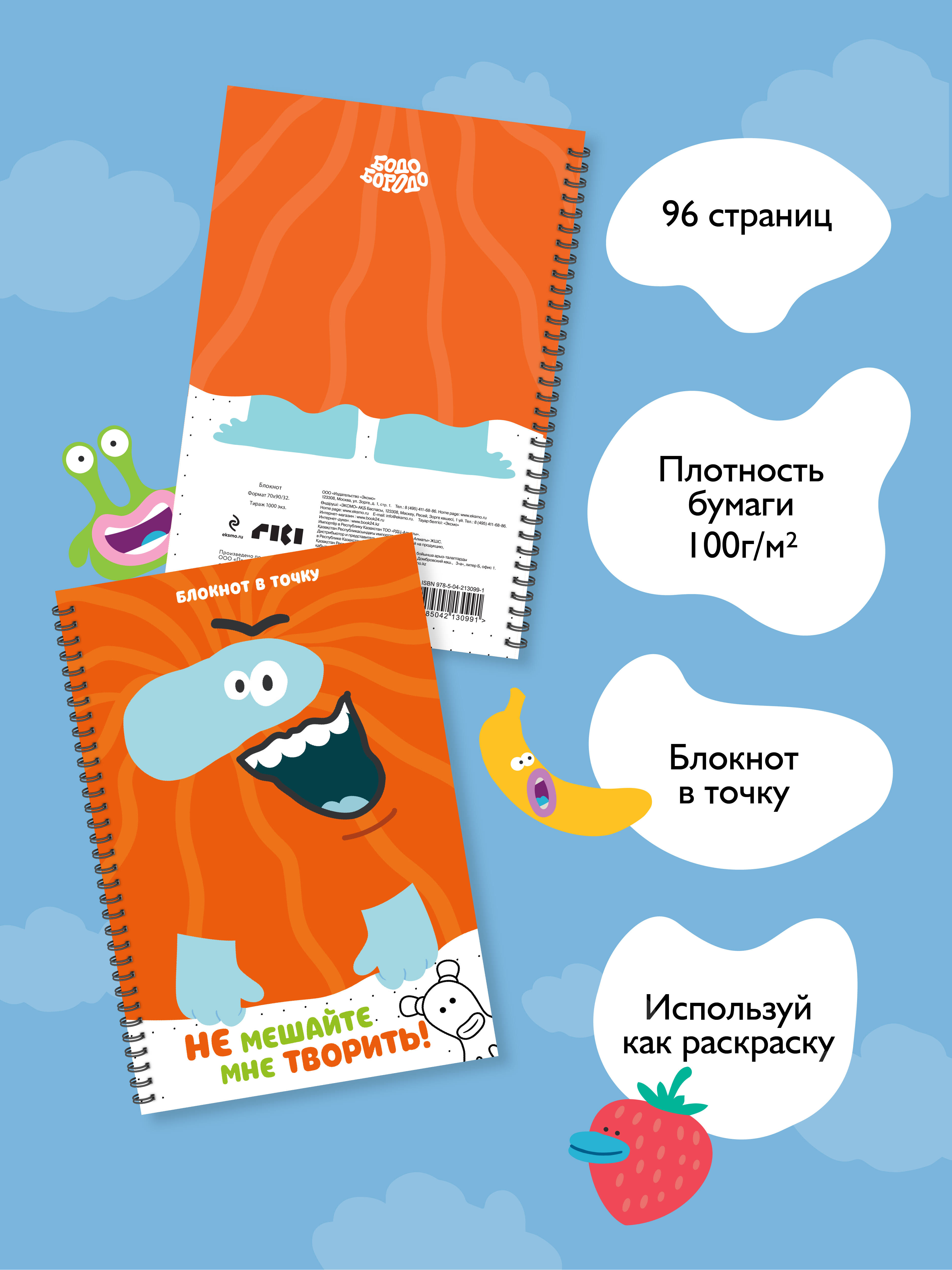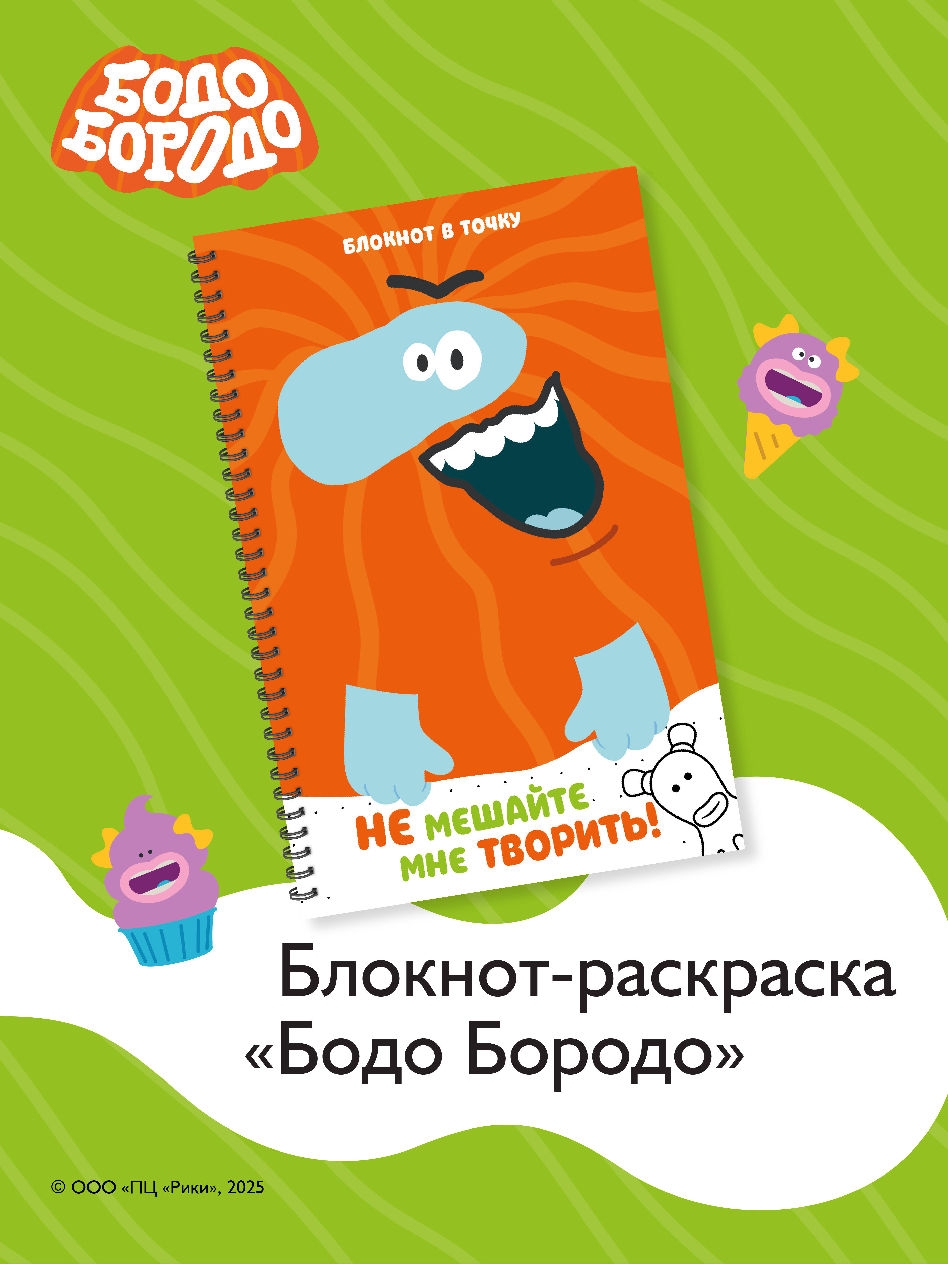 Бодо Бородо - лучший учитель в мире. Правда, только по его собственному мнению. Он не знает ничего, но сможет научить детей всему. Специально для этого он превратился в блокнот-раскраску в точку, чтобы вместе с вашим ребенком заняться творчеством. Блокнот на пружине. Размер А6 (107х165 мм). 96 страниц в точку. Страницы белые и плотные 100 гр/м2. На них можно рисовать цветными карандашами или ручками, а также учиться писать, рисовать и чертить. Чтобы ребенок не заскучал, Бодо будет поджидать его на каждой странице блокнота и предложит себя раскрасить. Отличный подарок для ваших детей на день рождения или Новый год! Соберите всю коллекцию с Бодо Бородо: Бодо Бородо. Блокнот-раскраска (А6, 96 стр. в точку, на пружине) Бодо Бородо. Наклейки (24 наклейки на 2 листах) Бодо Бородо. Временные переводные татуировки Бодо Бородо. 3Д стикеры на телефон Детский календарь настенный на 2026 год. Бодо Бородо (290х290 мм)| Издательство | ООО "Издательство "Эксмо" |