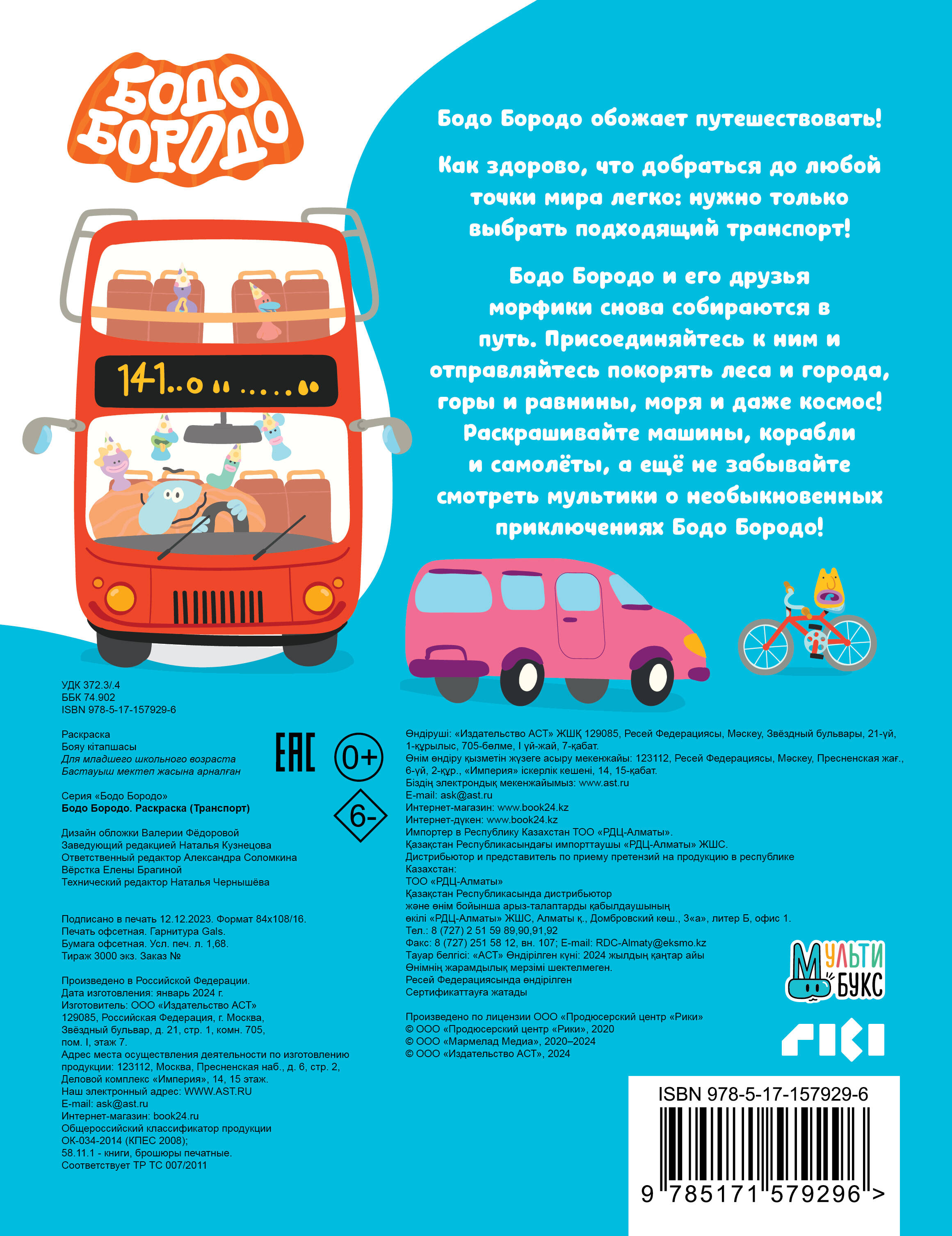 Бодо Бородо обожает путешествовать! Как здорово, что добраться до любой точки мира легко: нужно только выбрать подходящий транспорт! Бодо Бородо и его друзья морфики снова собираются в путь. Присоединяйтесь к ним и отправляйтесь покорять леса и города, горы и равнины, моря и даже космос! Раскрашивайте машины, корабли и самолёты, а ещё не забывайте смотреть мультики о необыкновенных приключениях Бодо Бородо!| Издательство | Издательство "АСТ" |