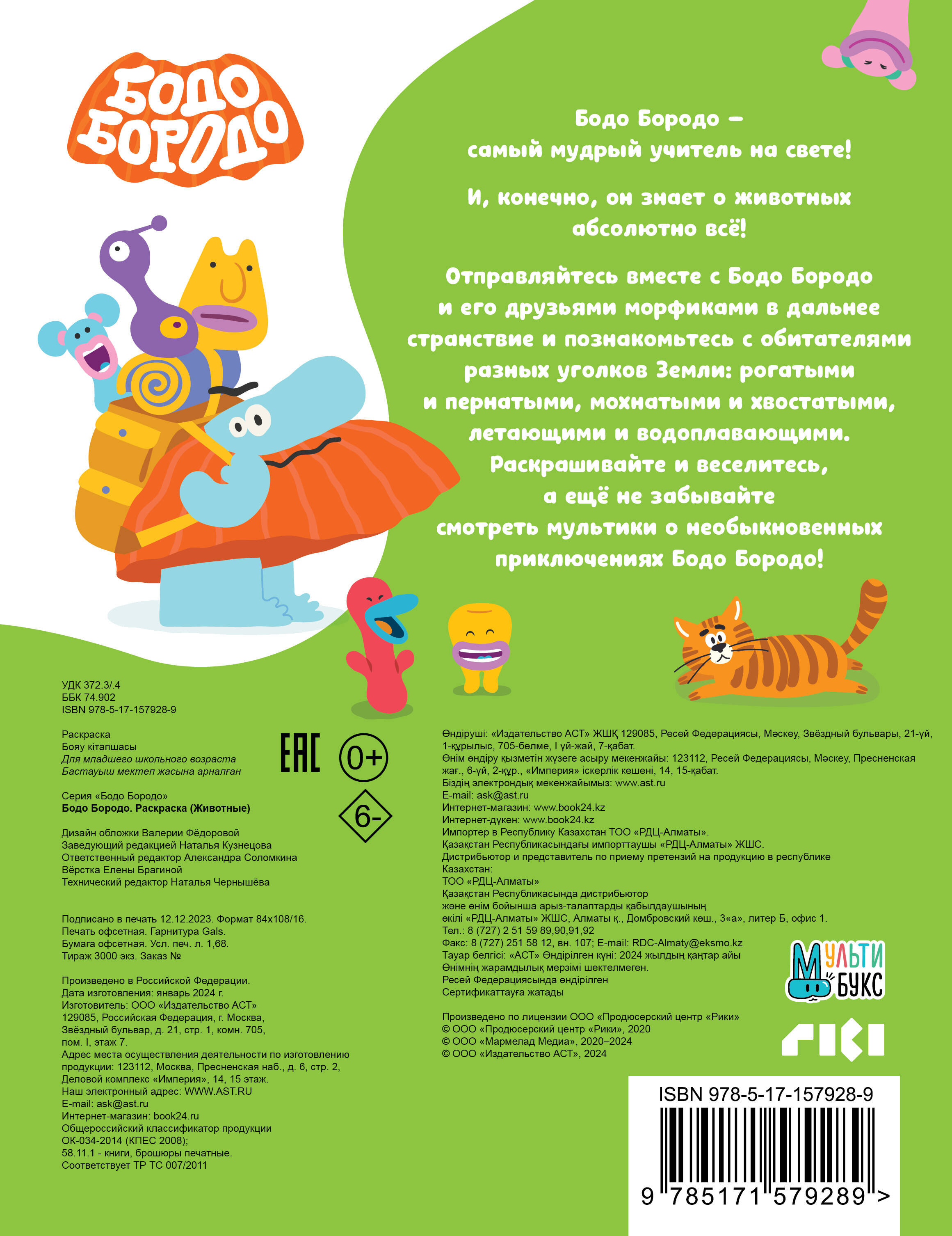 Бодо Бородо - самый мудрый учитель на свете! И, конечно, он знает о животных абсолютно всё! Отправляйтесь вместе с Бодо Бородо и его друзьями морфиками в дальнее странствие и познакомьтесь с обитателями разных уголков Земли: рогатыми и пернатыми, мохнатыми и хвостатыми, летающими и водоплавающими. Раскрашивайте и веселитесь, а ещё не забывайте смотреть мультики о необыкновенных приключениях Бодо Бородо!| Издательство | Издательство "АСТ" |