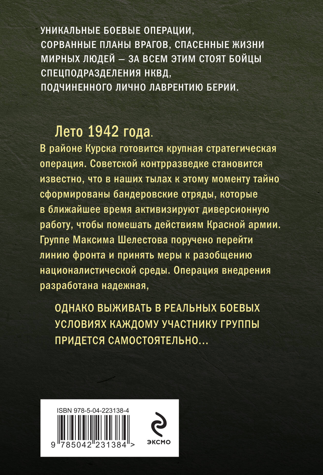 Роман о военном времени, о сложных судьбах и опасной работе неизвестных героев, вошедших в ударный состав «спецназа Берии». Лето 1943 года. В районе Курска готовится крупная стратегическая операция. Советской контрразведке становится известно, что в наших тылах к этому моменту тайно сформированы бандеровские отряды, которые в ближайшее время активизируют диверсионную работу, чтобы помешать действиям Красной Армии. Группе Максима Шелестова поручено перейти линию фронта и принять меры к разобщению националистической среды. Операция внедрения разработана надежная, однако выживать в реальных боевых условиях каждому участнику группы придется самостоятельно… «Эта серия хороша тем, что в ней проведена верная главная мысль: в НКВД Лаврентия Берии умели верить людям, потому что им умел верить сам нарком. История группы майора Шелестова сходна с реальной историей крупного агента абвера, бывшего штабс-капитана царской армии Нелидова, попавшего на Лубянку в сентябре 1939 года. Тем более вероятными выглядят на фоне истории Нелидова приключения Максима Шелестова и его товарищей, описанные в этом романе». - С. Кремлев Общий тираж книг А. Тамоникова - более 10 миллионов экземпляров.| Издательство | ООО "Издательство "Эксмо" |