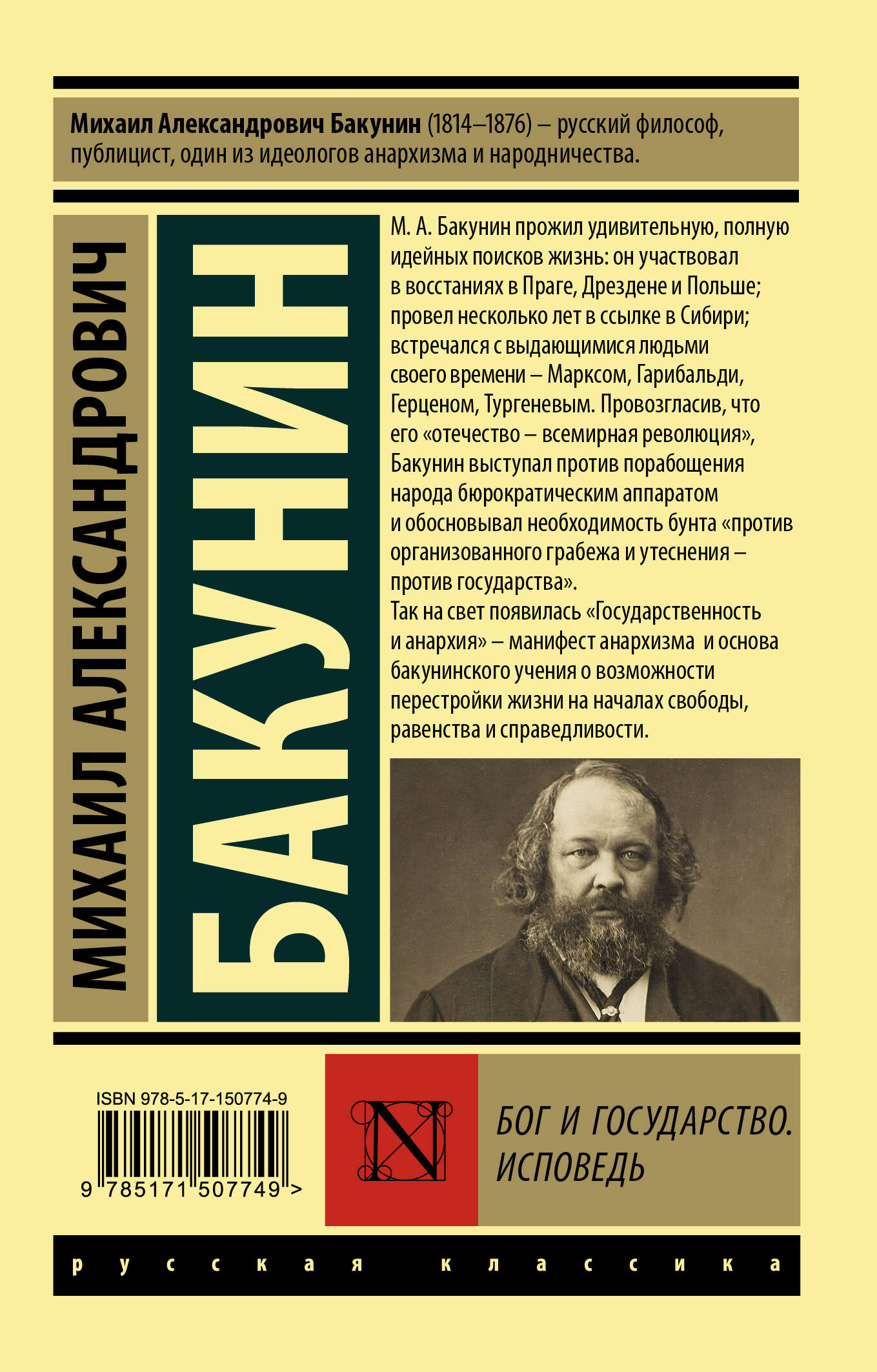 Михаил Александрович Бакунин (1814-1876) - русский философ, публицист, один из идеологов анархизма и народничества. "Исповедь", обращенная к российскому императору Николаю I, написана Бакуниным в Петропавловской крепости. Рукопись с собственноручными пометками царя была найдена в архиве Третьего отделения и впервые напечатана лишь в 1921 году. В этом произведении Бакунин описал свою жизнь и участие в революционном движении, а также изложил собственный взгляд на него, славянский вопрос и обустройство России. В сборник также включена незаконченная рукопись Бакунина "Бог и государство", в которой он критикует христианство и расцветающее в то время технократическое движение с материалистической, анархистской и индивидуалистической точек зрения.| Издательство | ИЗДАТЕЛЬСТВО "АСТ" |