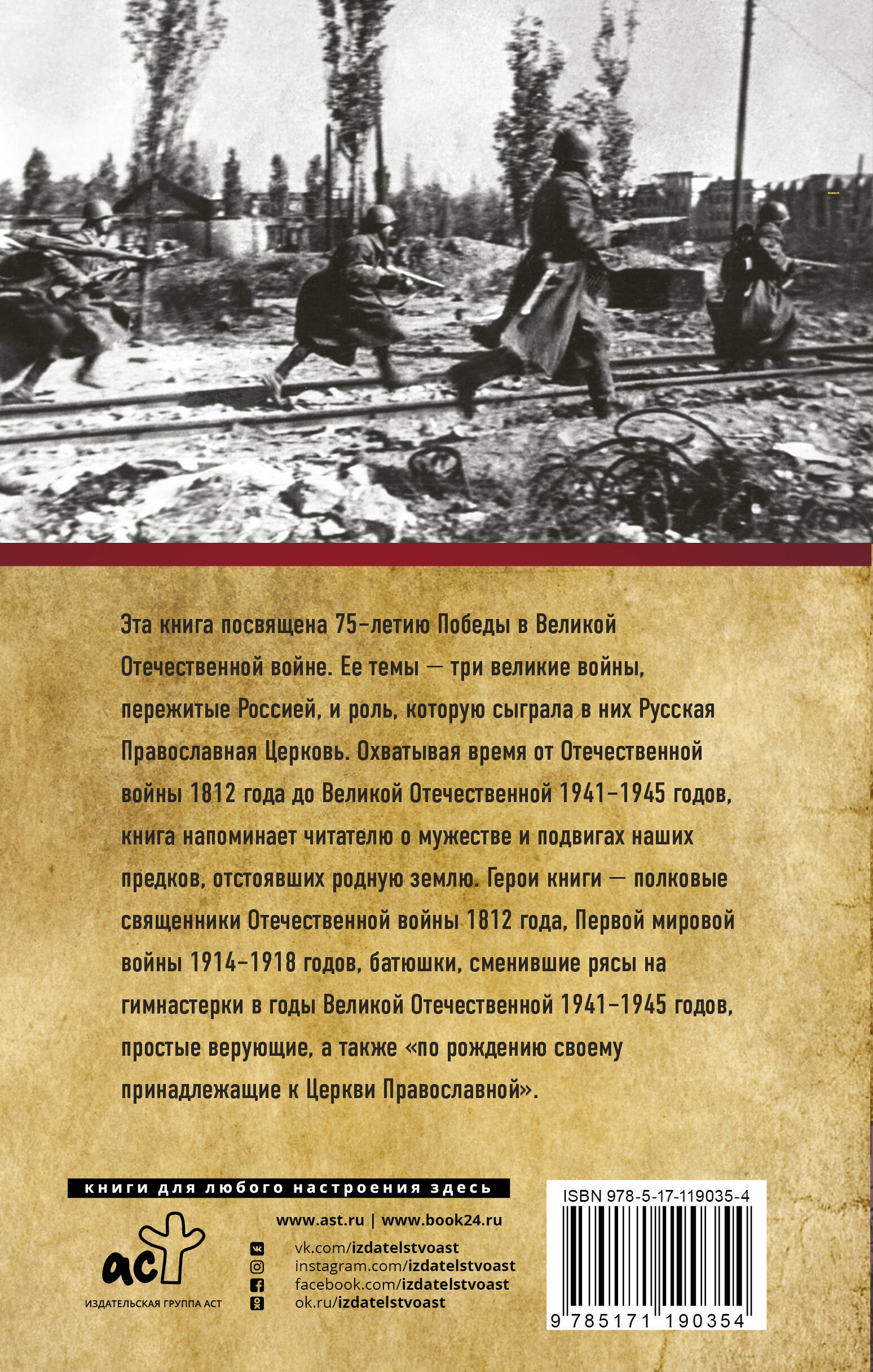 Эта книга посвящена 75-летию Победы в Великой отечественной войне. Ее темы - три великие войны, пережитые Россией, и роль, которую сыграла в них Русская Православная Церковь. Охватывая время от Отечественной войны 1812 года до Великой Отечественной 1941-1945 годов, книга напоминает читателю о мужестве и подвигах наших предков, отстоявших родную землю. Герои книги - полковые священники Отечественной войны 1812 года, Первой Мировой войны 1914-1918 годов, батюшки, сменившие рясы на гимнастерки в годы Великой Отечественной 1941-1945 годов, простые верующие, а также «по рождению своему принадлежащие к Церкви православной». Книга допущена к распространению Издательским Советом Русской Православной Церкви.| Издательство | Издательство "АСТ" |
