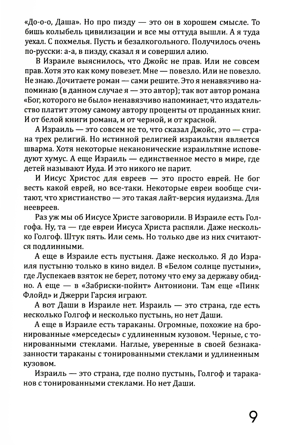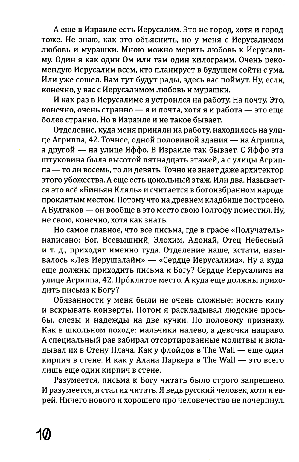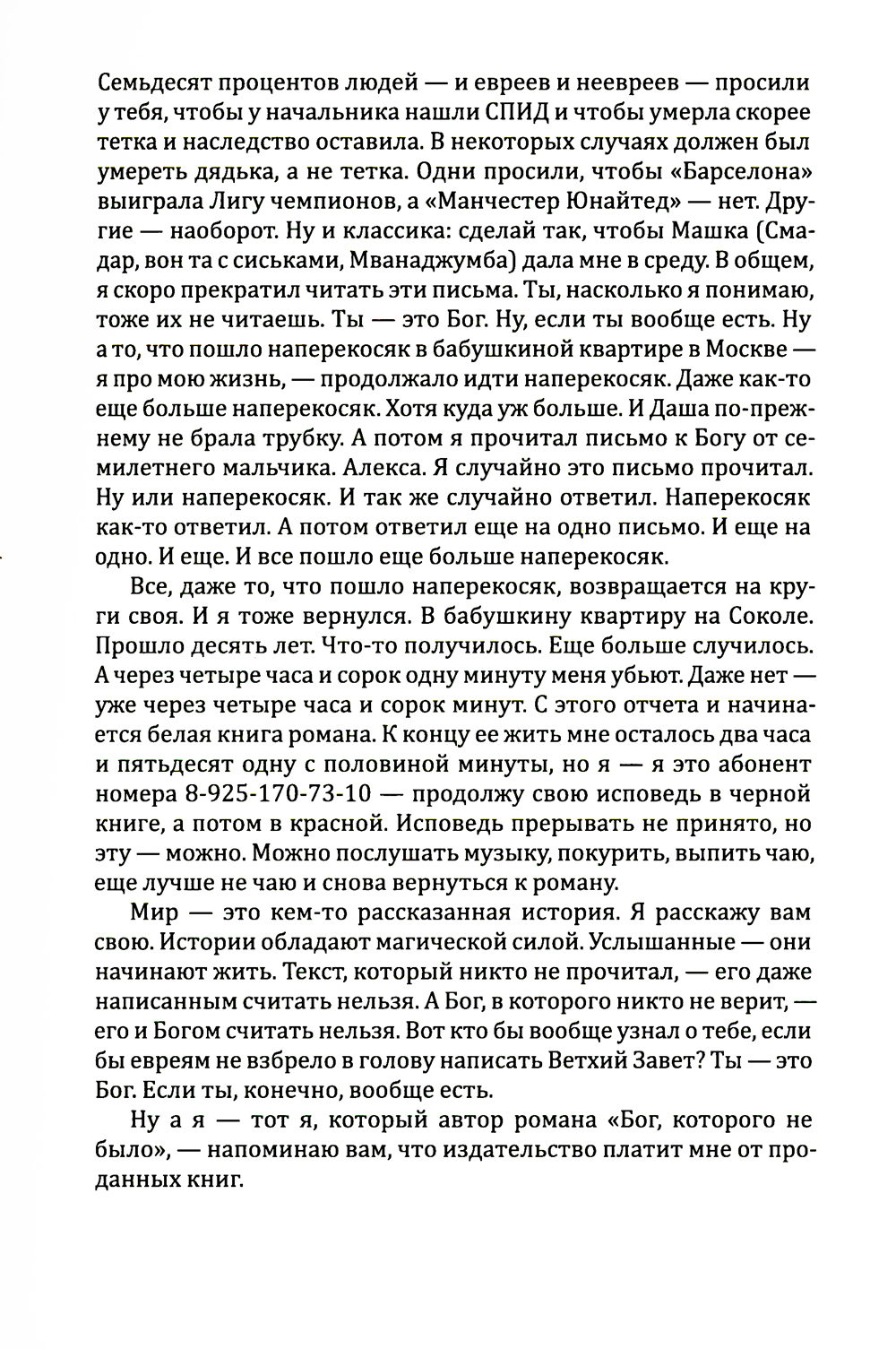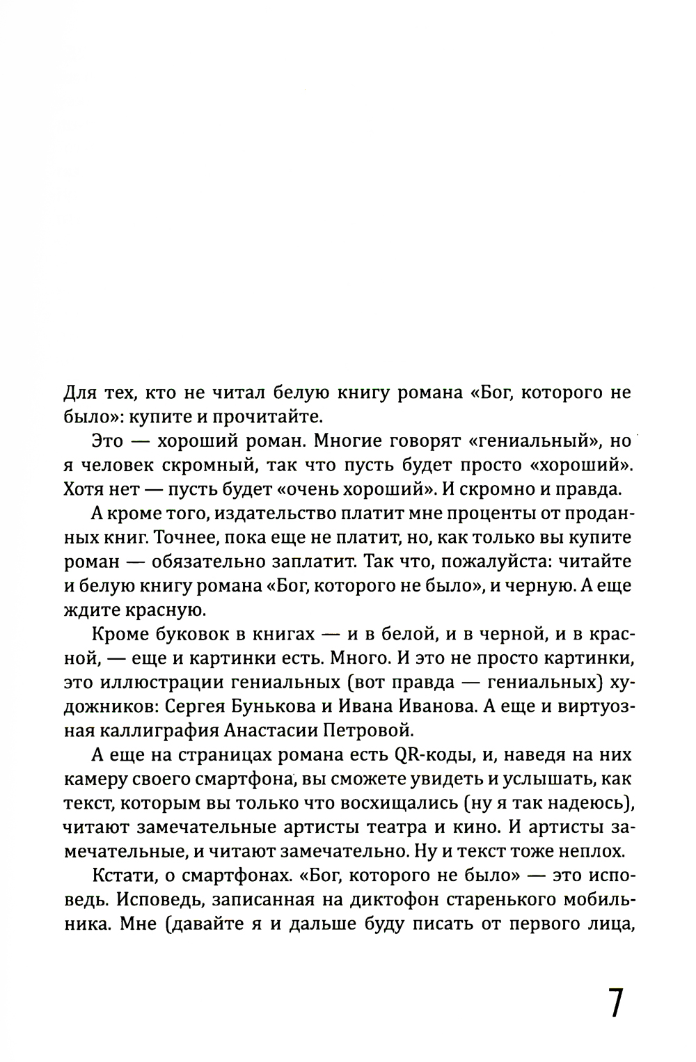 «Бог, которого не было» - это роман-исповедь. В Иерусалиме, рядом со Стеной Плача, есть почтовое отделение. Обычное почтовое отделение, но все письма, где в графе «Получатель» написано: Бог, Всевышний, Элохим, Адонай, Отец Небесный и т. д., приходят именно туда. Конверты вскрывают, а письма закладывают в расщелины Стены Плача. Считается, что так Бог быстрее узнает и скорее отреагирует. Двадцатилетний парень, приехавший из России, получает эту нехитрую работенку - вскрывать конверты с письмами Богу. Читать письма категорически запрещено, но наш парень однажды не сдержался и полюбопытствовал. А потом совсем не сдержался - и ответил. Вместо Бога. Потом ответил на еще одно, потом еще. Впервые в истории человечества у этого самого человечества было настоящее, вещественное доказательство существования Бога. Он отвечает на письма… Десять лет. Многобукаф. Три книги романа - белая, черная, красная. Исповедь Бога, которого не было. Исповедь, записанная на айфон. Наперегонки со смертью.| Издательство | Рипол Классик |