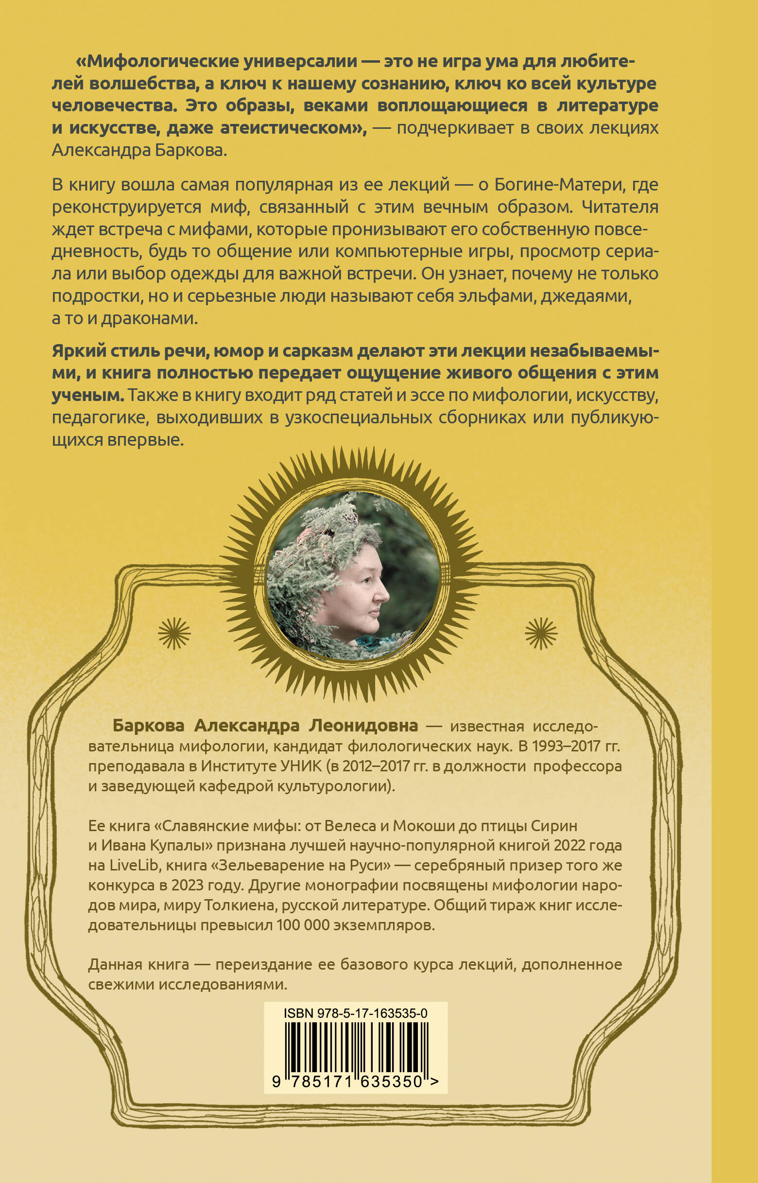 "Мифологические универсалии - это не игра ума для любителей волшебства, а ключ к нашему сознанию, ключ ко всей культуре человечества. Это образы, веками воплощающиеся в литературе и искусстве, даже атеистическом", - подчеркивает в своих лекциях Александра Баркова. В книгу вошла самая популярная из ее лекций - о Богине-Матери, где реконструируется миф, связанный с этим вечным образом. Читателя ждет встреча с мифами, которые пронизывают его собственную повседневность, будь то общение или компьютерные игры, просмотр сериала или выбор одежды для важной встречи. Он узнает, почему не только подростки, но и серьезные люди называют себя эльфами, джедаями, а то и драконами. Яркий стиль речи, юмор и сарказм делают эти лекции незабываемыми, и книга полностью передает ощущение живого общения с этим ученым. Также в книгу входит ряд статей и эссе по мифологии, искусству, педагогике, выходивших в узкоспециальных сборниках или публикующихся впервые.| Издательство | Издательство "АСТ" |