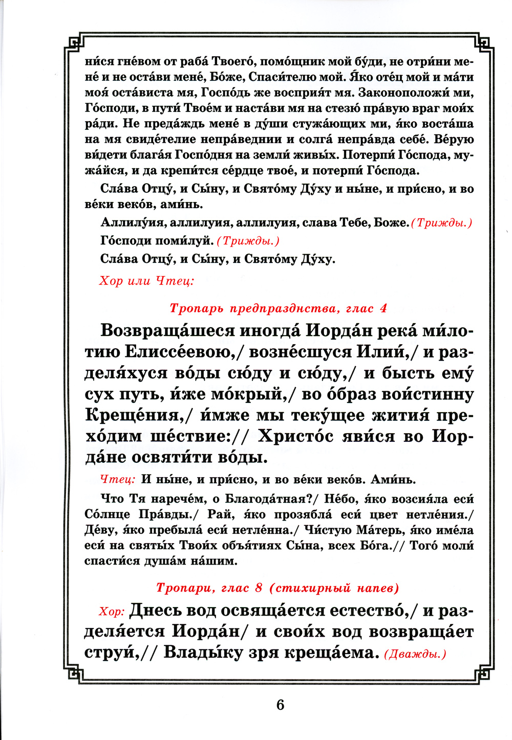 Издание содержит доследование службы Крещенского сочельника, Великий чин освящения воды и тексты праздничного богослужения Богоявления. Двухцветная печать, традиционная для богослужебных изданий, облегчает визуальное восприятие. Неизменяемые нотные песнопения и текст чтеца набраны средним шрифтом, а изменяемые песнопения - укрупненным, с ударениями и разметкой для пения. Текст службы сопровождают указания, которые помогут регенту на богослужении, а также примечания, отображающие приходские традиции.| Издательство | Синопсисъ |