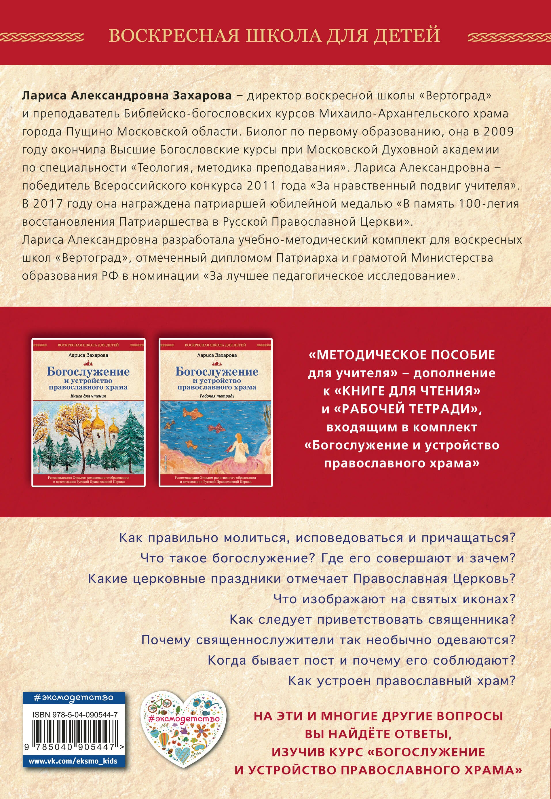 Книга знакомит с особенностями преподавания курса «Богослужение и устройство православного храма», задача которого рассказать детям 8-10 лет о Боге и Церкви, ввести ребёнка в храм. Автор книги - известный педагог и директор воскресной школы Лариса Захарова. За создание этого учебно-методического комплекта она получила диплом Патриарха. Материал апробирован во многих воскресных школах и рекомендован Отделом религиозного образования и катехизации Русской Православной Церкви. Книга будет полезна учащимся православных гимназий, на уроках «Основы православной культуры» в светских школах, и родителям, которые стремятся воспитать своих детей в духе православной веры. Обучающий комплект «Богослужение и устройство православного храма включает также «Книгу для чтения» и «Рабочую тетрадь». Издание рекомендовано Отделом религиозного образования и катехизации Русской Православной Церкви.| Издательство | ООО "Издательство "Эксмо" |