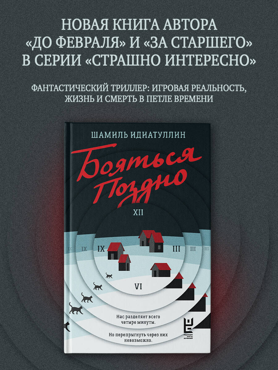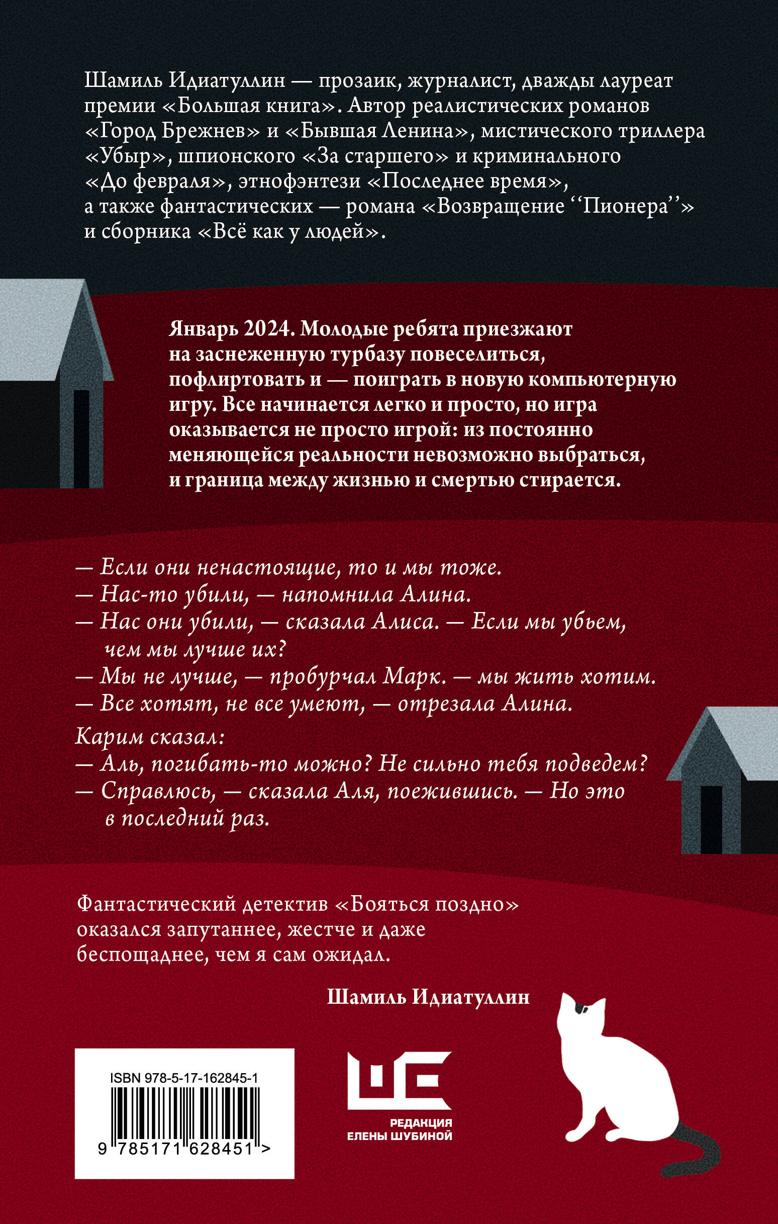 Шамиль Идиатуллин - прозаик, журналист, дважды лауреат премии "Большая книга". Автор реалистических романов "Город Брежнев" и "Бывшая Ленина", мистического триллера "Убыр", шпионского "За старшего" и криминального "До февраля", этнофэнтези "Последнее время", а также фантастических - романа "Возвращение "Пионера"" и сборника "Всё как у людей". Январь 2024. Молодые ребята приезжают на заснеженную турбазу повеселиться, пофлиртовать и - поиграть в новую компьютерную игру. Все начинается легко и просто, но игра оказывается не просто игрой: из постоянно меняющейся реальности невозможно выбраться, и граница между жизнью и смертью стирается. - Если они ненастоящие, то и мы тоже. - Нас-то убили, - напомнила Алина. - Нас они убили, - сказала Алиса. - Если мы убьем, чем мы лучше их? - Мы не лучше, - пробурчал Марк. - мы жить хотим. - Все хотят, не все умеют, - отрезала Алина. Карим сказал: - Аль, погибать-то можно? Не сильно тебя подведем? - Справлюсь, - сказала Аля, поежившись. - Но это в последний раз. "Фантастический детектив "Бояться поздно" оказался запутаннее, жестче и даже беспощаднее, чем я сам ожидал". Шамиль Идиатуллин