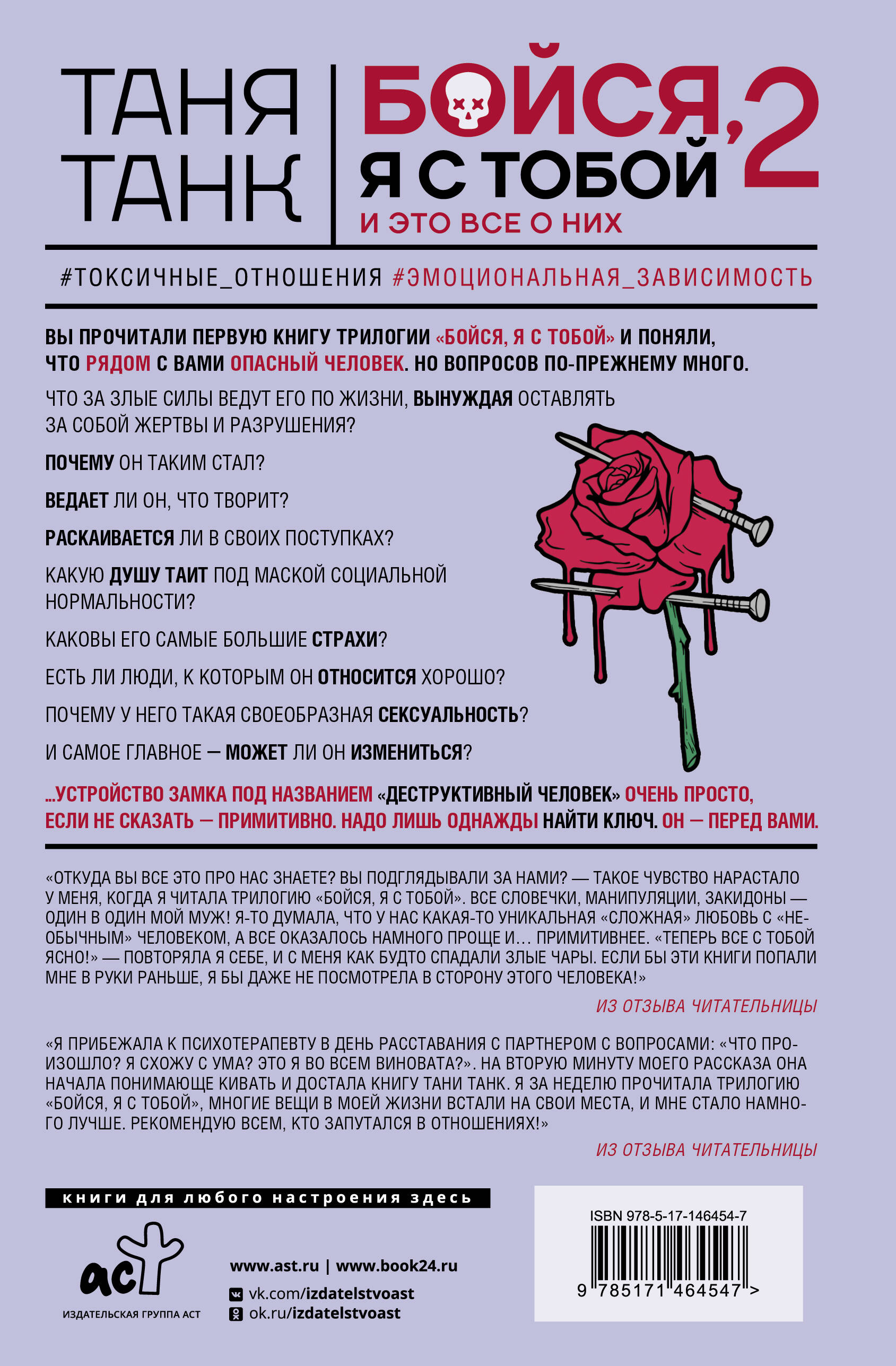 «Откуда вы все это знаете? Вы подглядывали за нами? - такое чувство нарастало у меня, когда я читала трилогию "Бойся, я с тобой". Все словечки, манипуляции, закидоны - один в один мой муж! Я-то думала, что у нас какая-то уникальная "сложная" любовь с "необычным" человеком, а все оказалось намного проще и… примитивнее. "Теперь все с тобой ясно!" - повторяла я себе, и с меня как будто спадали злые чары. Если бы эти книги попали мне в руки раньше, я бы даже не посмотрела в сторону этого человека!» Из отзыва читательницы «Я прибежала к психотерапевту в день расставания с партнером с вопросами: "Что произошло? Я схожу с ума? Это я во всем виновата?". На вторую минуту моего рассказа она начала понимающе кивать и достала книгу Тани Танк. Я за неделю прочитала трилогию "Бойся, я с тобой", многие вещи в моей жизни встали на свои места, и мне стало намного лучше. Рекомендую всем, кто запутался в отношениях!» Из отзыва читательницы| Издательство | АСТ |