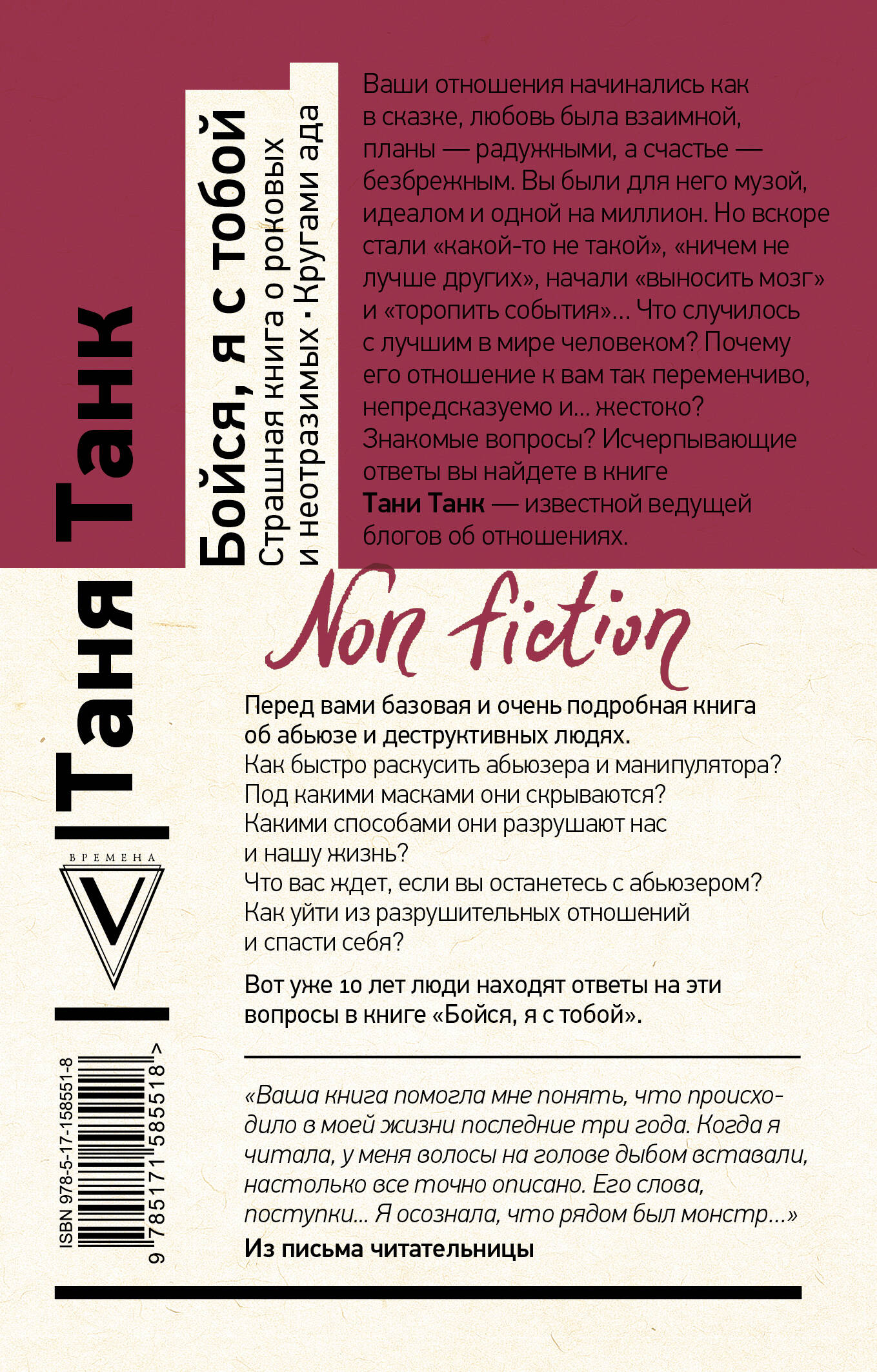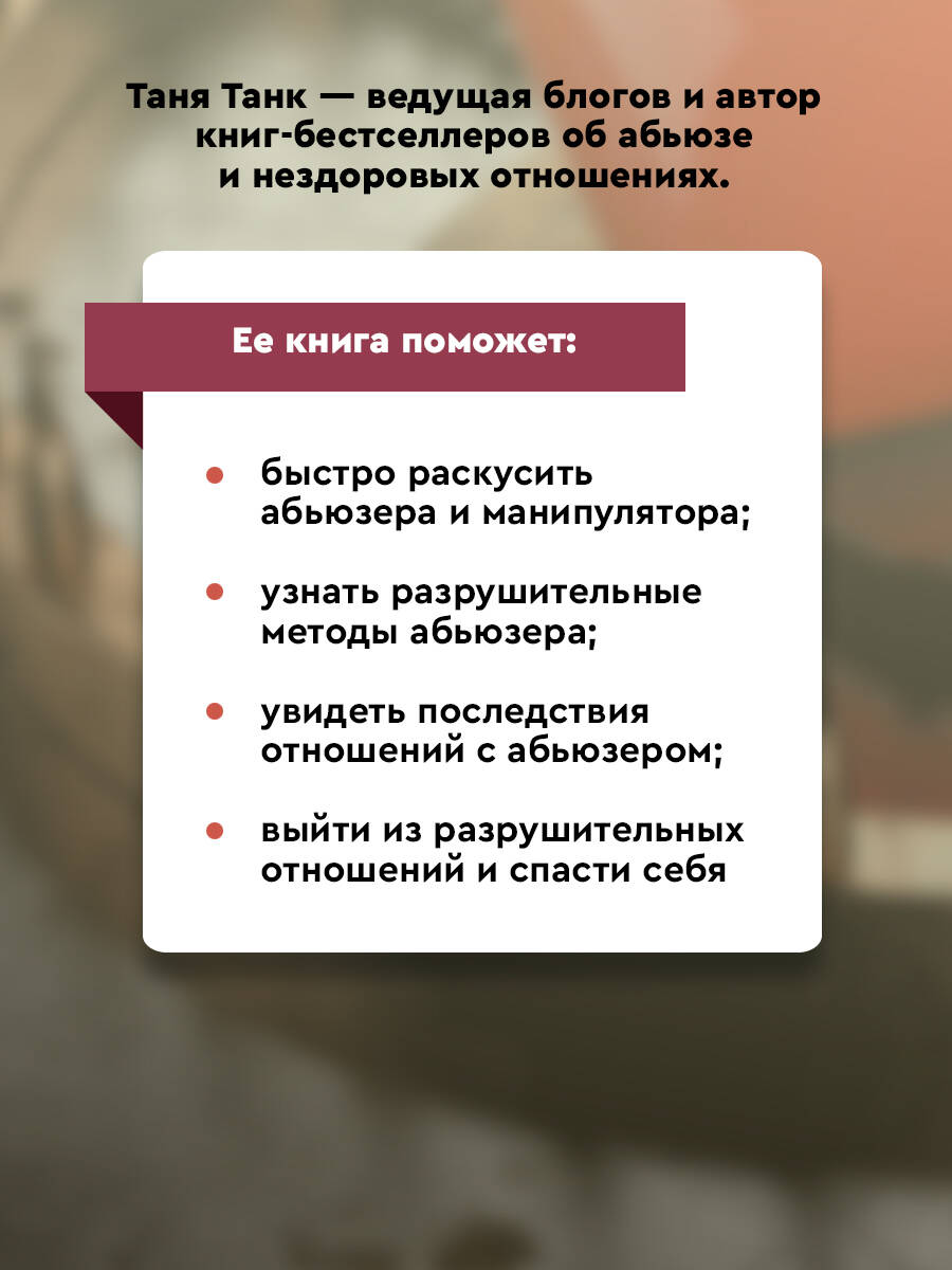 Ваши отношения начинались как в сказке, любовь была взаимной, планы - радужными, а счастье - безбрежным. Вы были для него музой, идеалом и одной на миллион. Но вскоре стали "какой-то не такой", "ничем не лучше других", начали "выносить мозг" и "торопить события"… Что случилось с лучшим в мире человеком? Почему его отношение к вам так переменчиво, непредсказуемо и... жестоко? Знакомые вопросы? Исчерпывающие ответы вы найдете в книге Тани Танк - известной ведущей блогов об отношениях. Перед вами базовая и очень подробная книга об абьюзе и деструктивных людях, в которой вы узнаете: Как быстро раскусить абьюзера и манипулятора? Под какими масками они скрываются? Какими способами они разрушают нас и нашу жизнь? Что вас ждет, если вы останетесь с абьюзером? Как уйти из разрушительных отношений и спасти себя?| Издательство | Издательство "АСТ" |