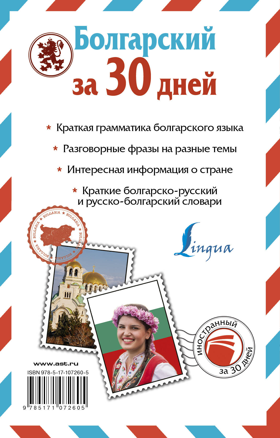 "Болгарский за 30 дней" - это отличный помощник для тех, кто хочет выучить болгарский легко и быстро. Самоучитель состоит из трех частей. Краткая грамматика знакомит с особенностями болгарского письма, произношения и частями речи. Разговорник содержит самые необходимые слова и фразы для свободного общения. Болгарско-русский и русско-болгарский словари помогут расширить словарный запас. Самоучитель будет полезен всем, кто интересуется болгарским языком или начинает его изучать.